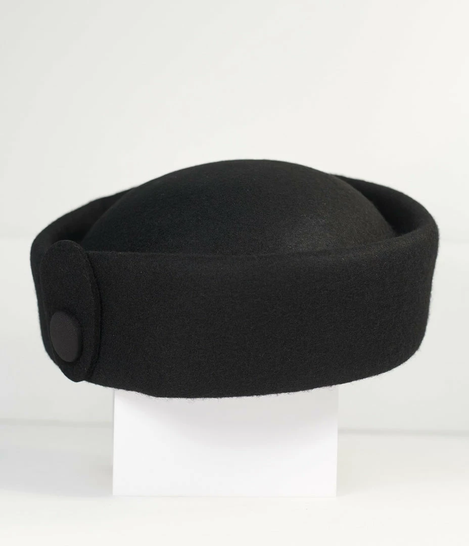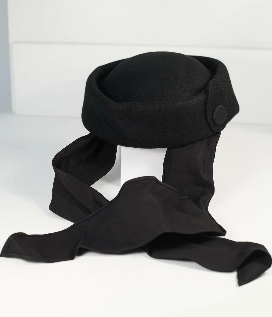 For a vintage vixen! A delectably lush black wool pillbox from Unique Vintage, this darling vintage accessory features a faux button tab and an attached scarf tie for glamorous styling. Secured with dual combs and an elastic cord while you can adjust the inner ribbon with velcro for easy wear!