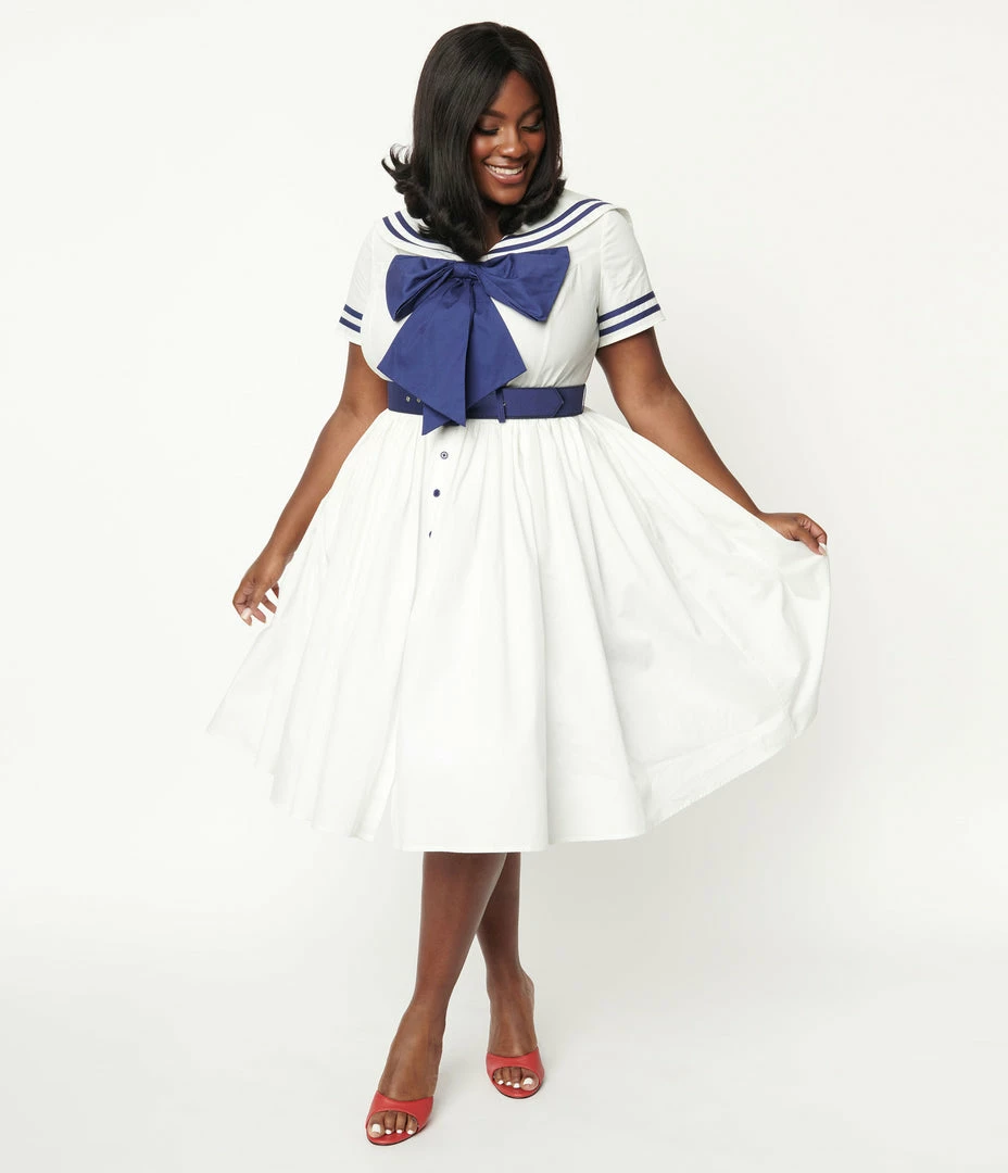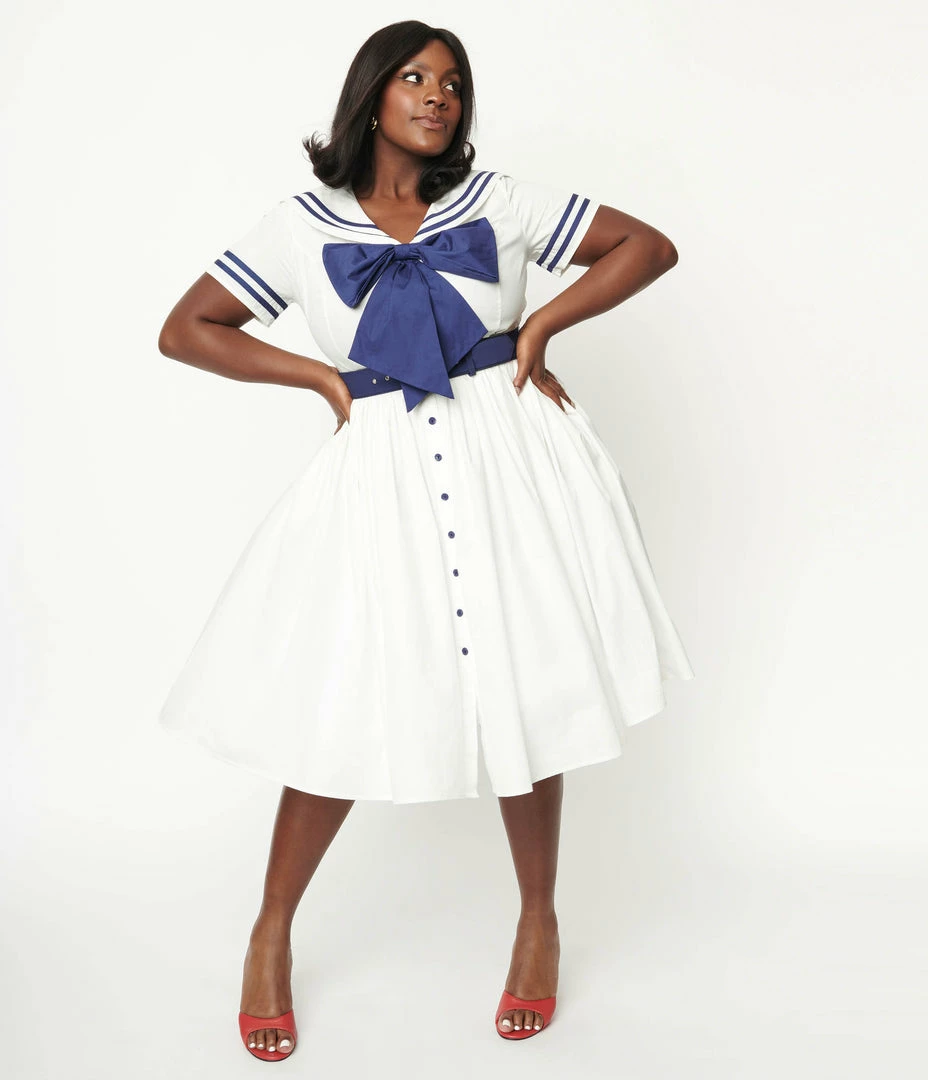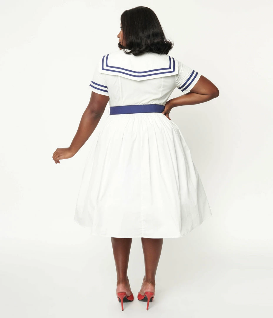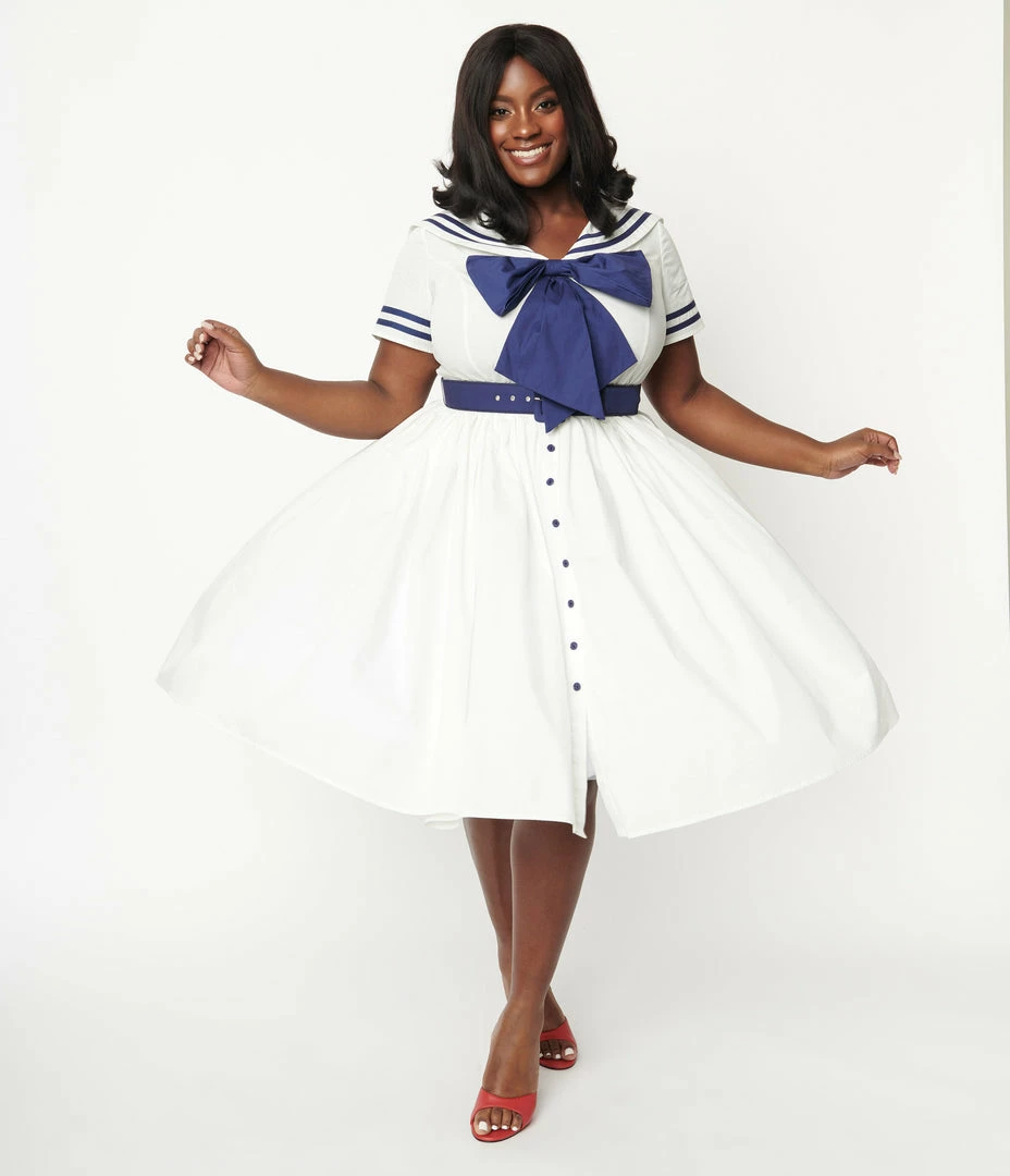 1930s & 1940s Unique Vintage Plus Size White & Navy Seas The Day Swing Dress