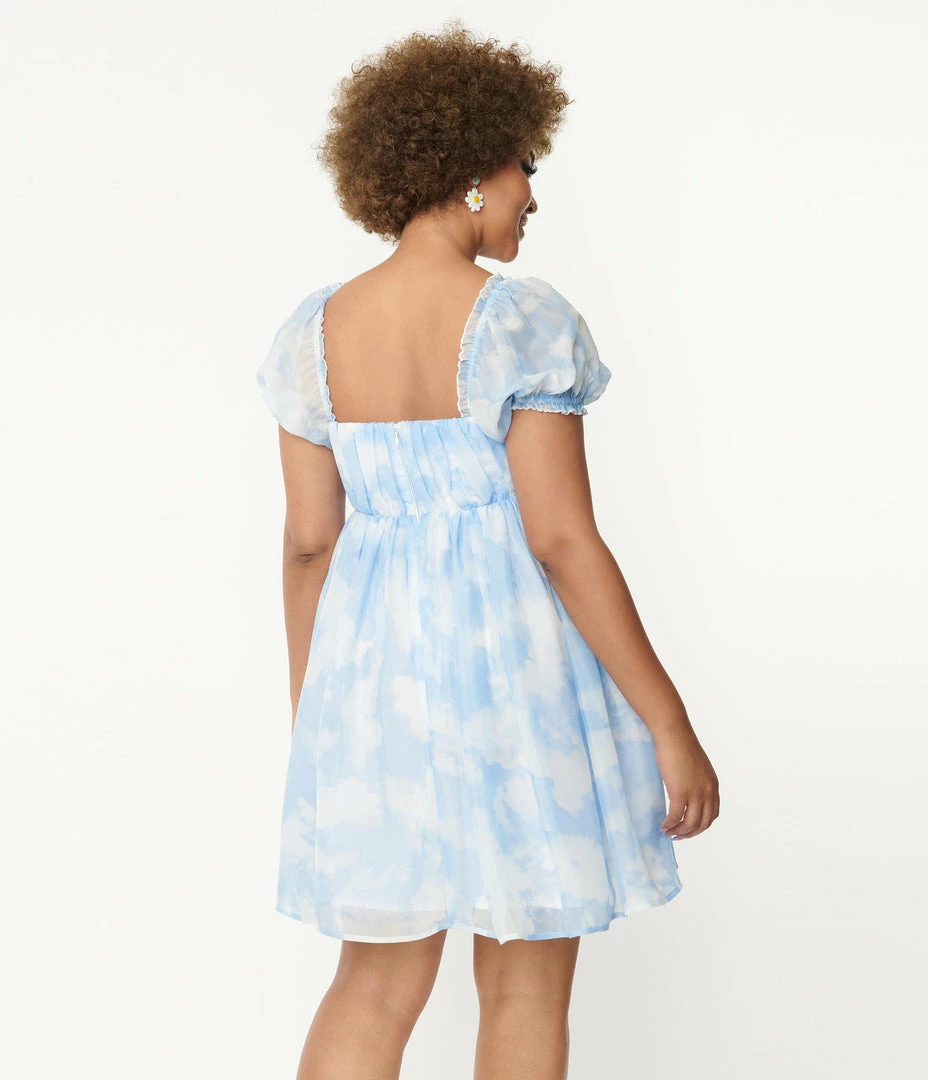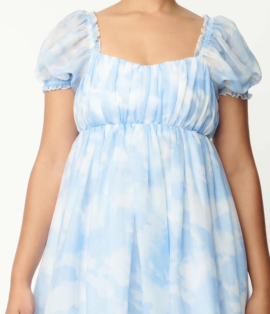 Crafted in a lightweight chiffon that dances with a gorgeous blue sky and white cloud print throughout. The Belle Dress features a scoop neckline, framed with sheer bardot sleeves that flatter your figure. The empire seamed waist is cinched with a back zipper as smocked sides lend a comfortable fit while the gathered babydoll skirt cascades over white lining!