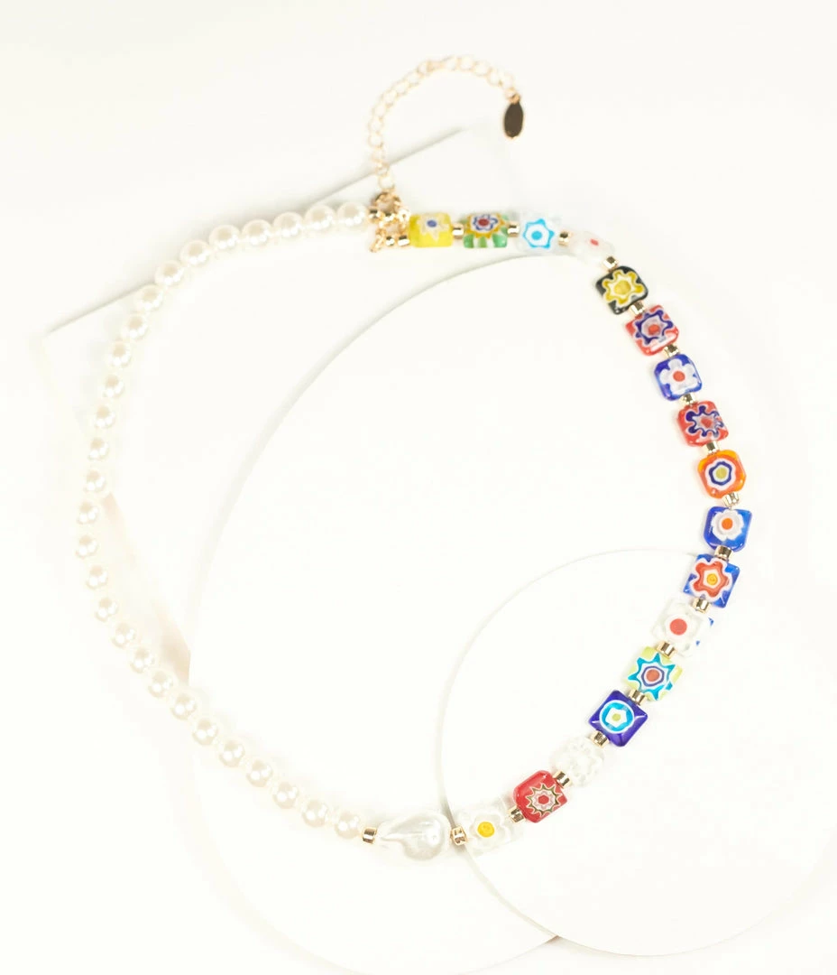 No need to dive deep, this darling necklace is a fabulous accessory with multicolor square glass beads on one side that boast beautiful floral design throughout while gleaming faux ivory pearls embellish the other side, centered by an irregular faux pearl. Complete with 14K gold plating and secured with an adjustable lobster clasp for comfortable wear!