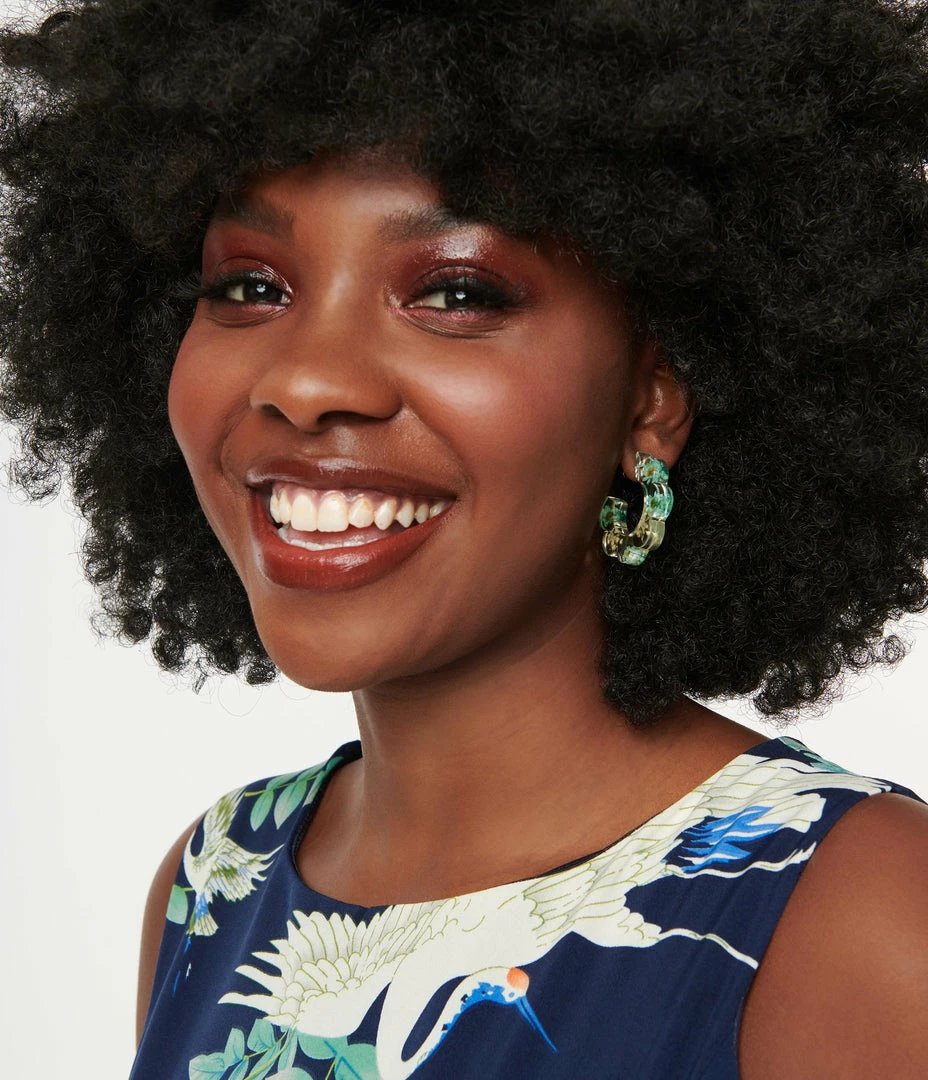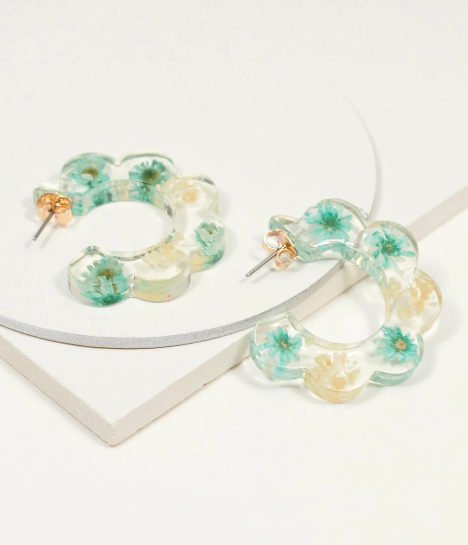 Showcase your grace with these dainty scalloped acrylic hoops that boast blue and white florals suspended throughout. Secured with post backs!