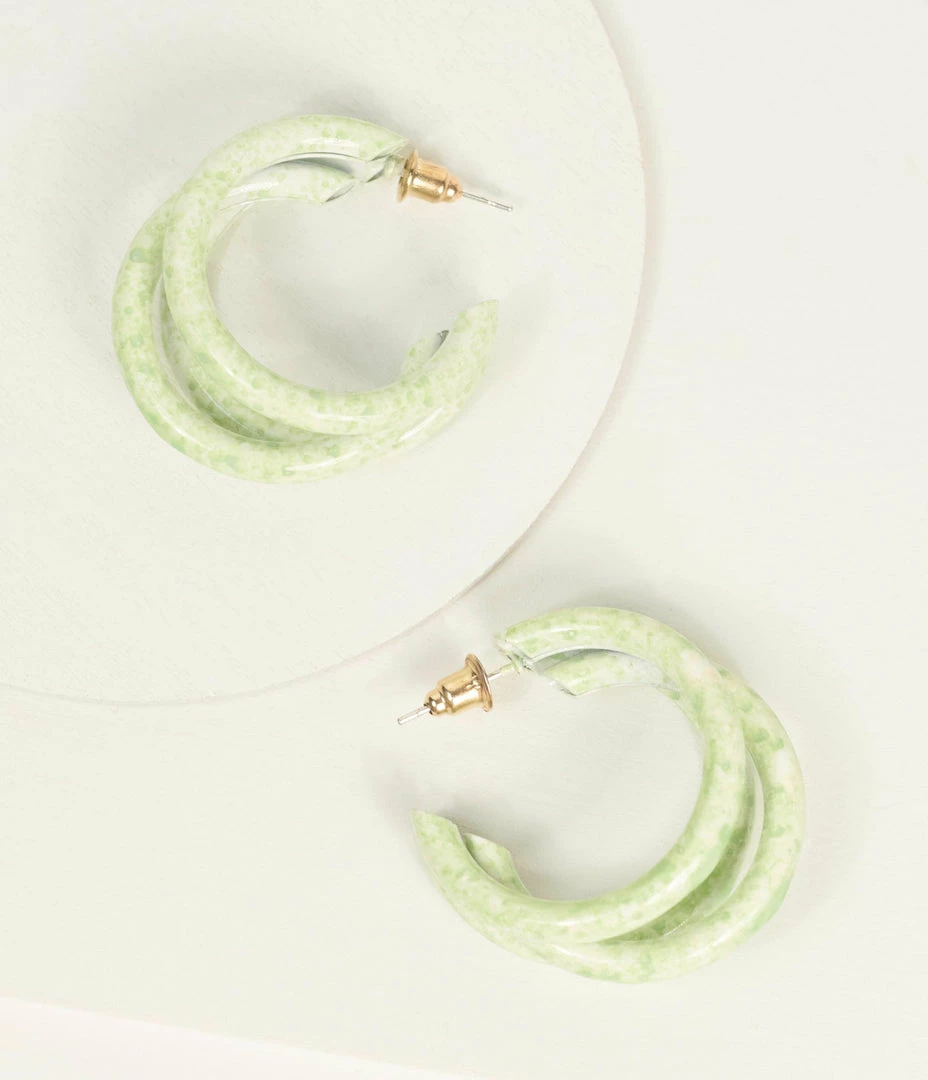 Retro radiant in a sweet green speckled design, this trilogy hoops are set in metal and secured with post backs!