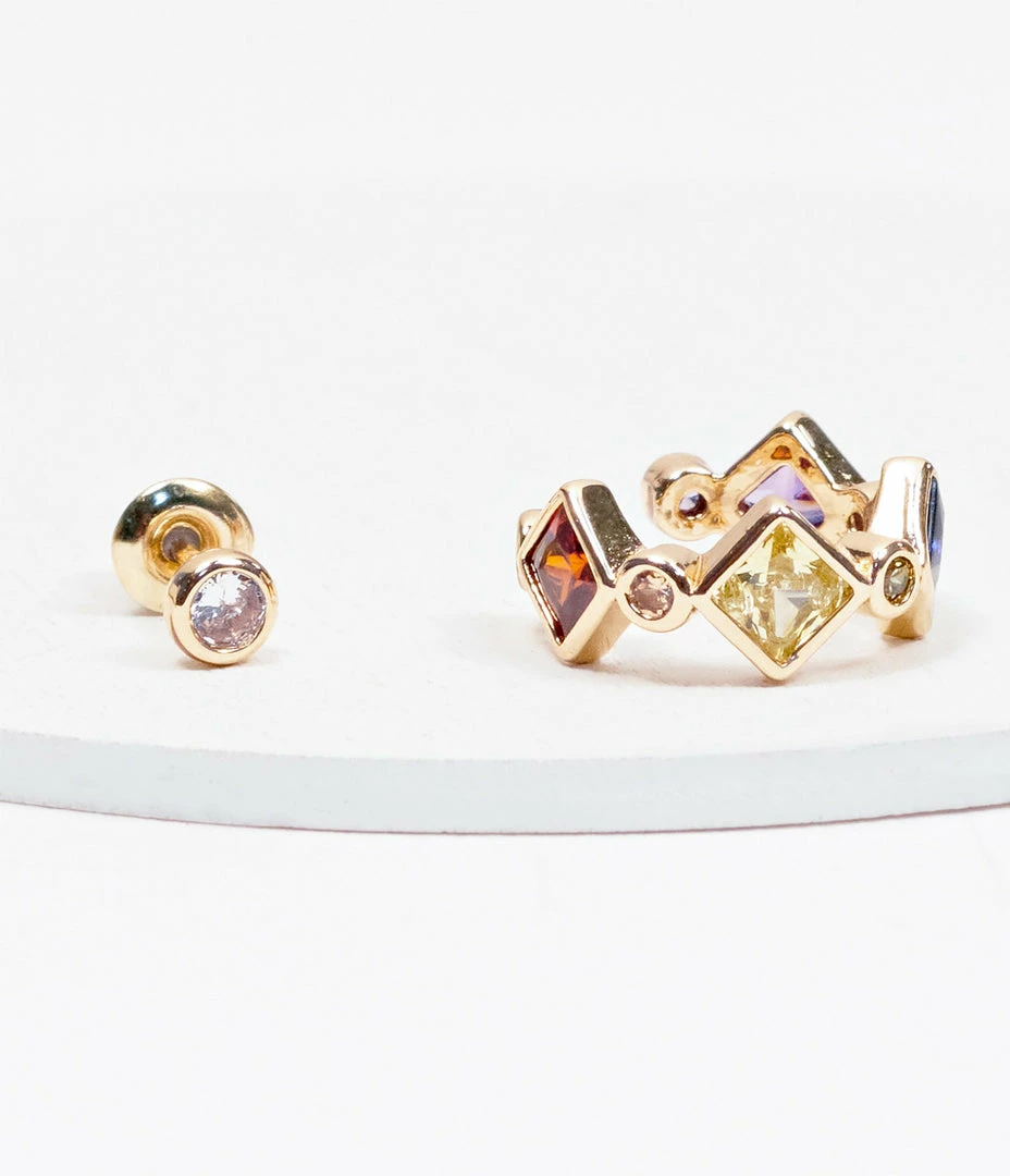 A sweet charm for a playful soul, this adorable set of four earrings is perfect to mix and match depending on your mood! Set in 14K gold plating and boasting one colorful rhinestone ear cuff, one silver rhinestone stud back, and two hinge clasp hoop drop earrings boasting a beaded apple charm on one, and a beaded mushroom charm on the other!