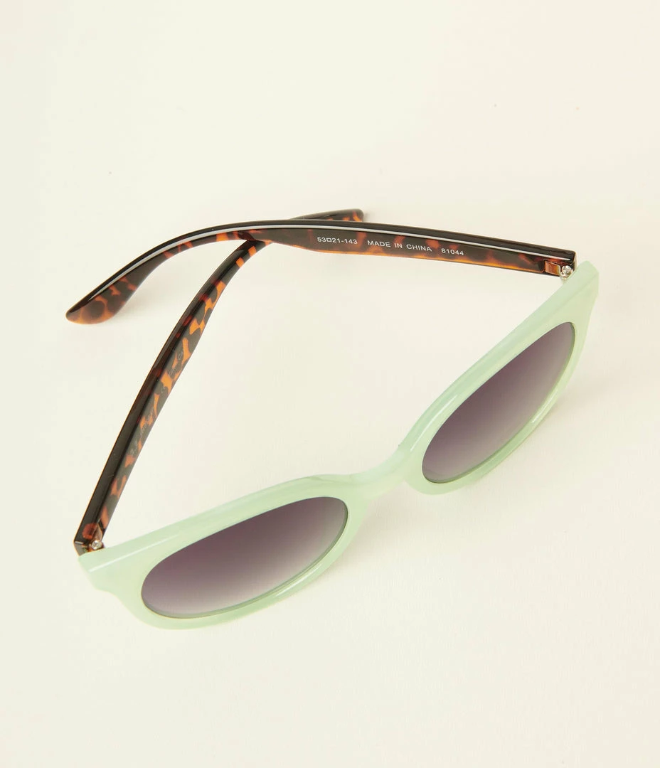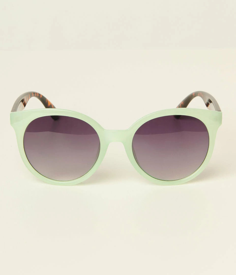 These retro sunglasses feature rounded seafoam frames that hold tinted lenses. Complete with tortoise shell curved arms and molded nose pads.