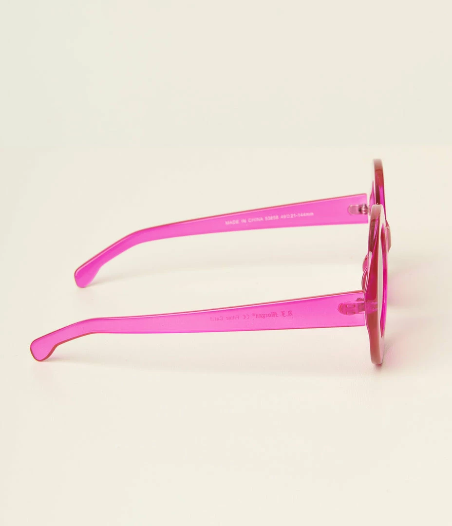 These retro sunglasses feature tinted, impact resistant lenses, set in large rounded frames set in a clear purple setting. Created with molded pads and tapered arms.