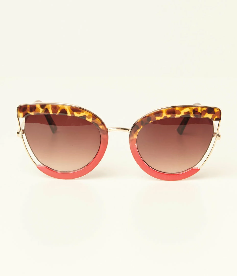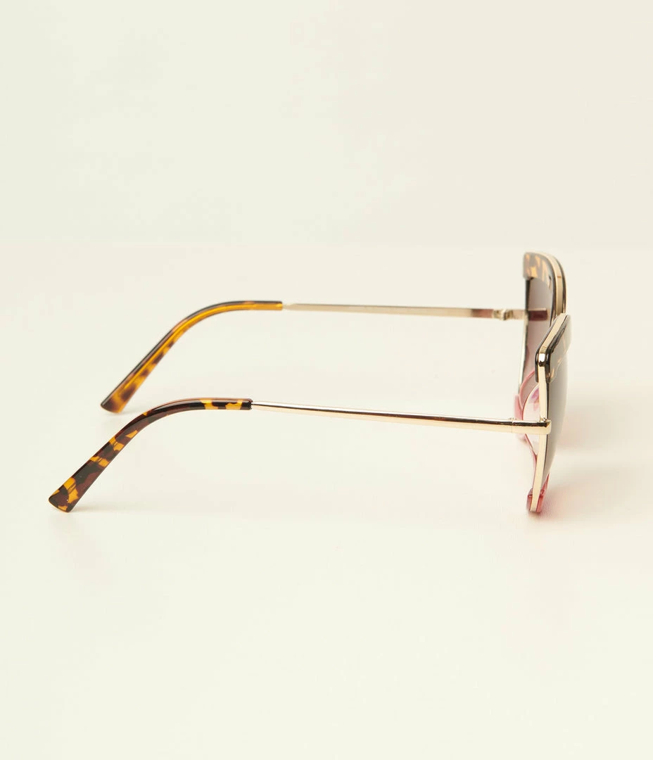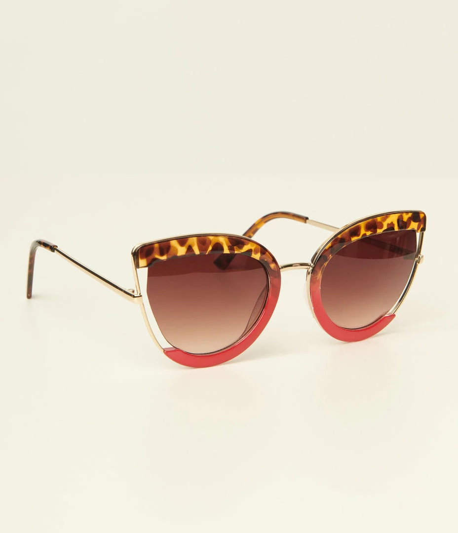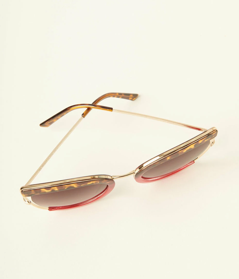 Styled in a vintage cat-eye design, these sunglasses with pseudo-floating tinted lenses set in red and tortoise shell polycarbonate frames and featuring steel hinges, curves arms, and molded nose.