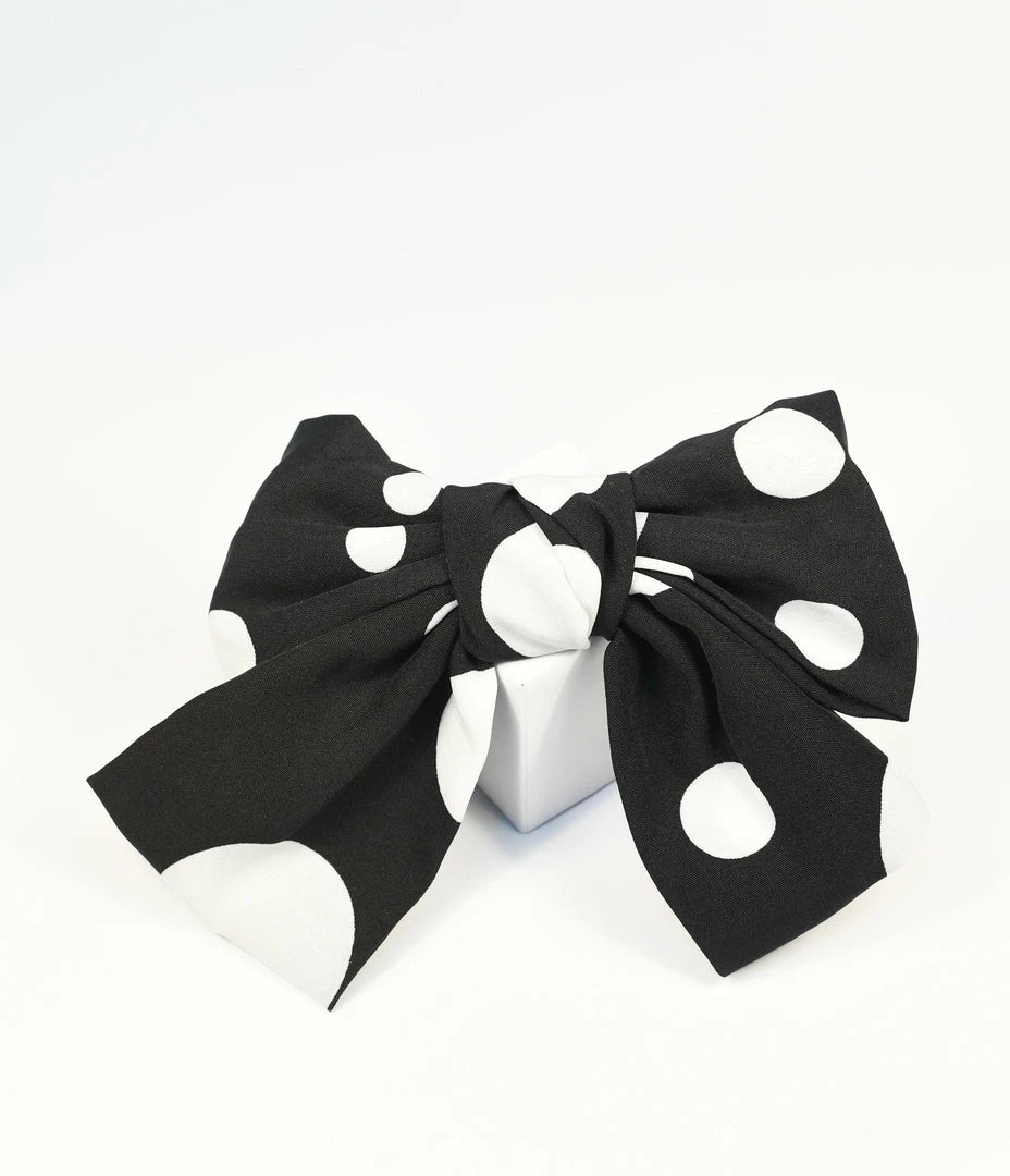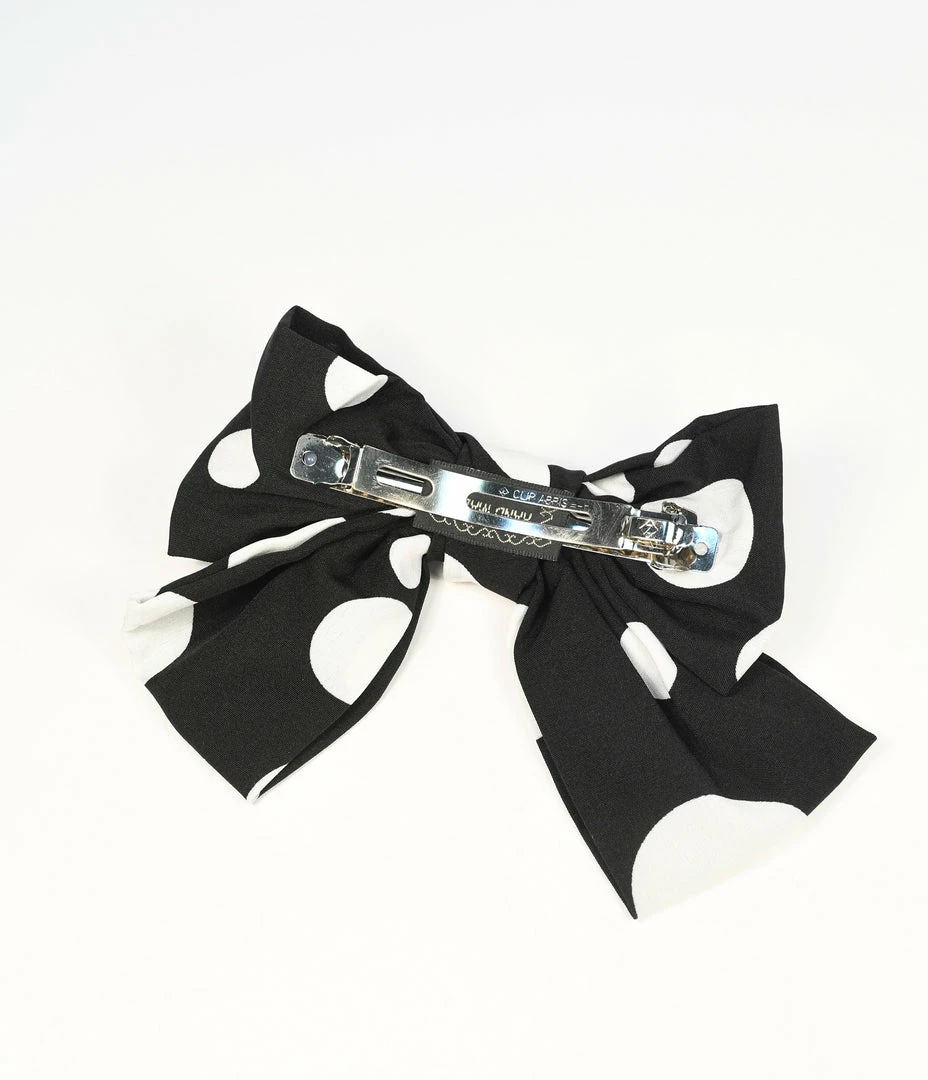 The finishing touch to your retro ensemble, this darling hair clip is set in a bow design and features black fabric with white polka dots, secured with a French barrette clip!