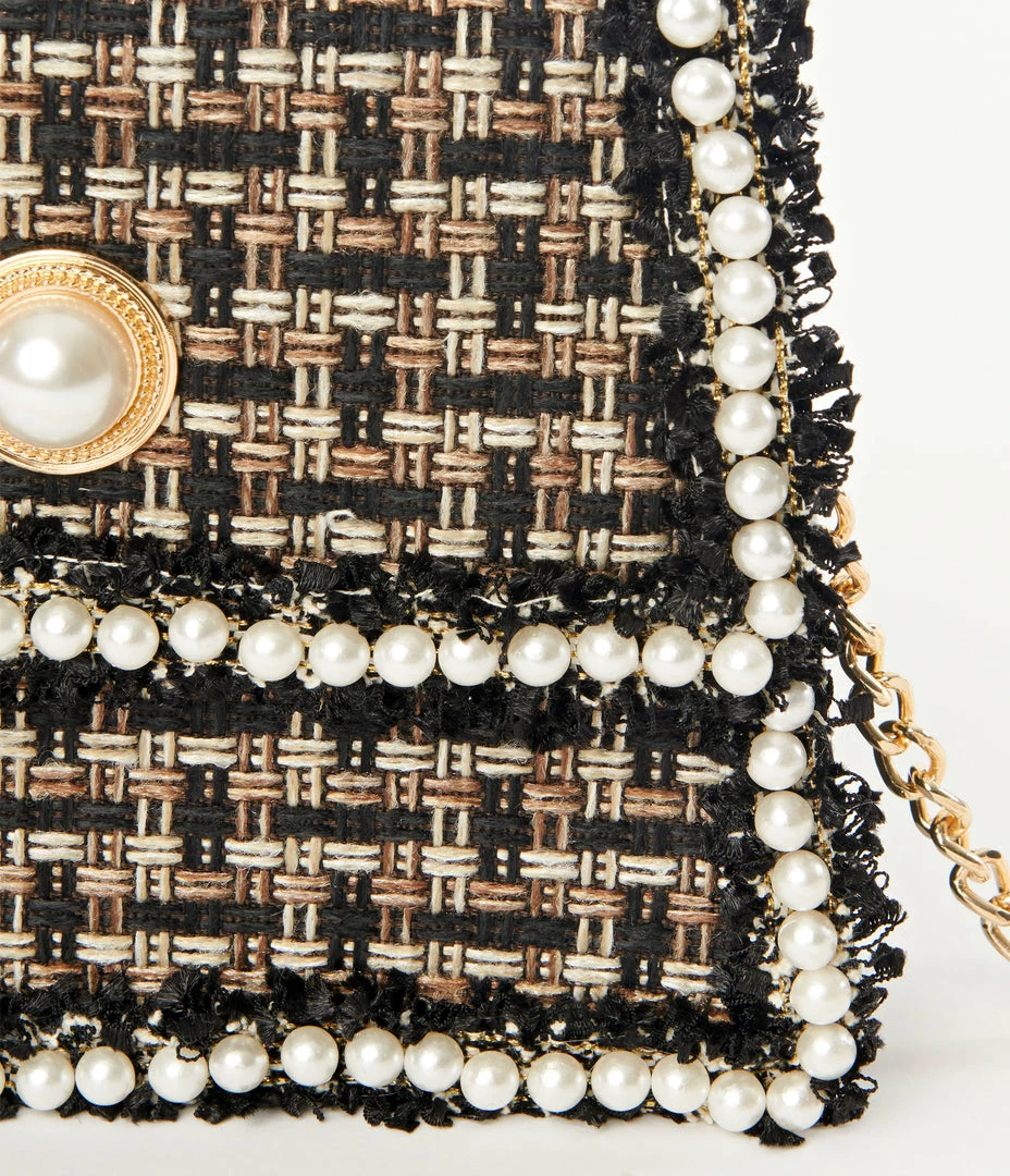 This sweet handbag is crafted in a fabulous black leatherette covered in black & gold tweed plaid, accented with faux pearls. Complete with top handle and magnetic closure.