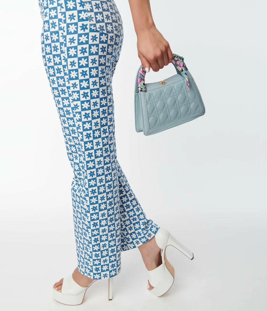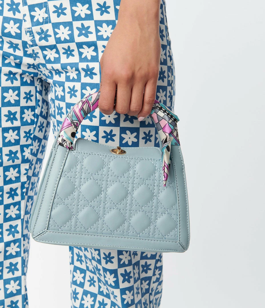 This darling vintage inspired purse is crafted in a light blue leatherette and boasts a fun quilted pattern. The dual tops handles are accented with wrapped scarf detailing on one handle, while the removable chain shoulder strap lends versatile wear. The twist lock closure opens to a black fabric inner complete with inner slip pocket to keep your items organized!
