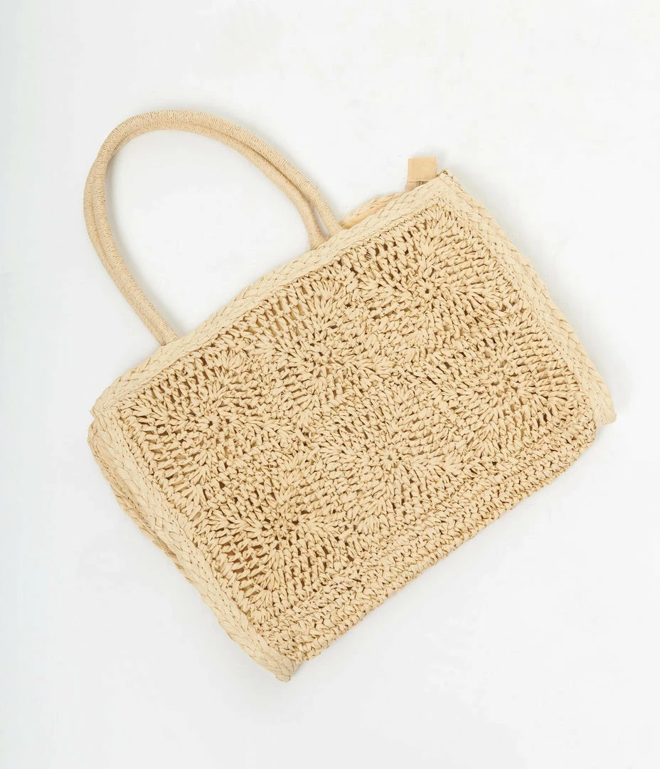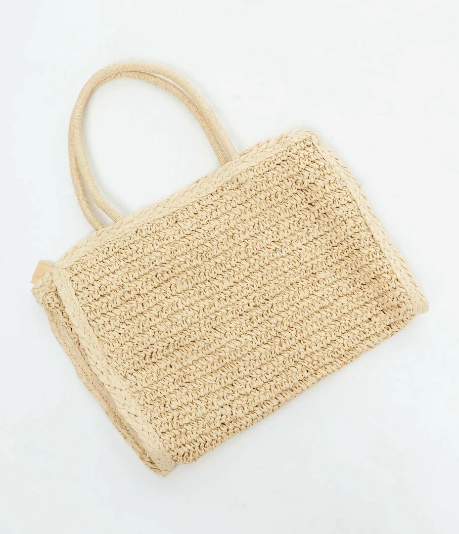 A darling tote bag, featuring beige straw-like textile, braided in a charming design and boasting a fabric interior. Outfitted with dual top handles, a top zipper, and an inner slip pocket.
