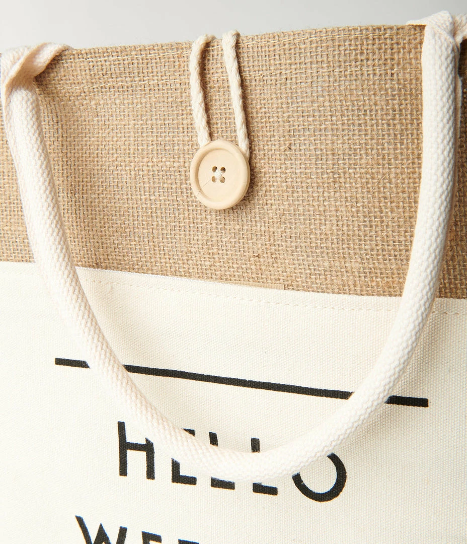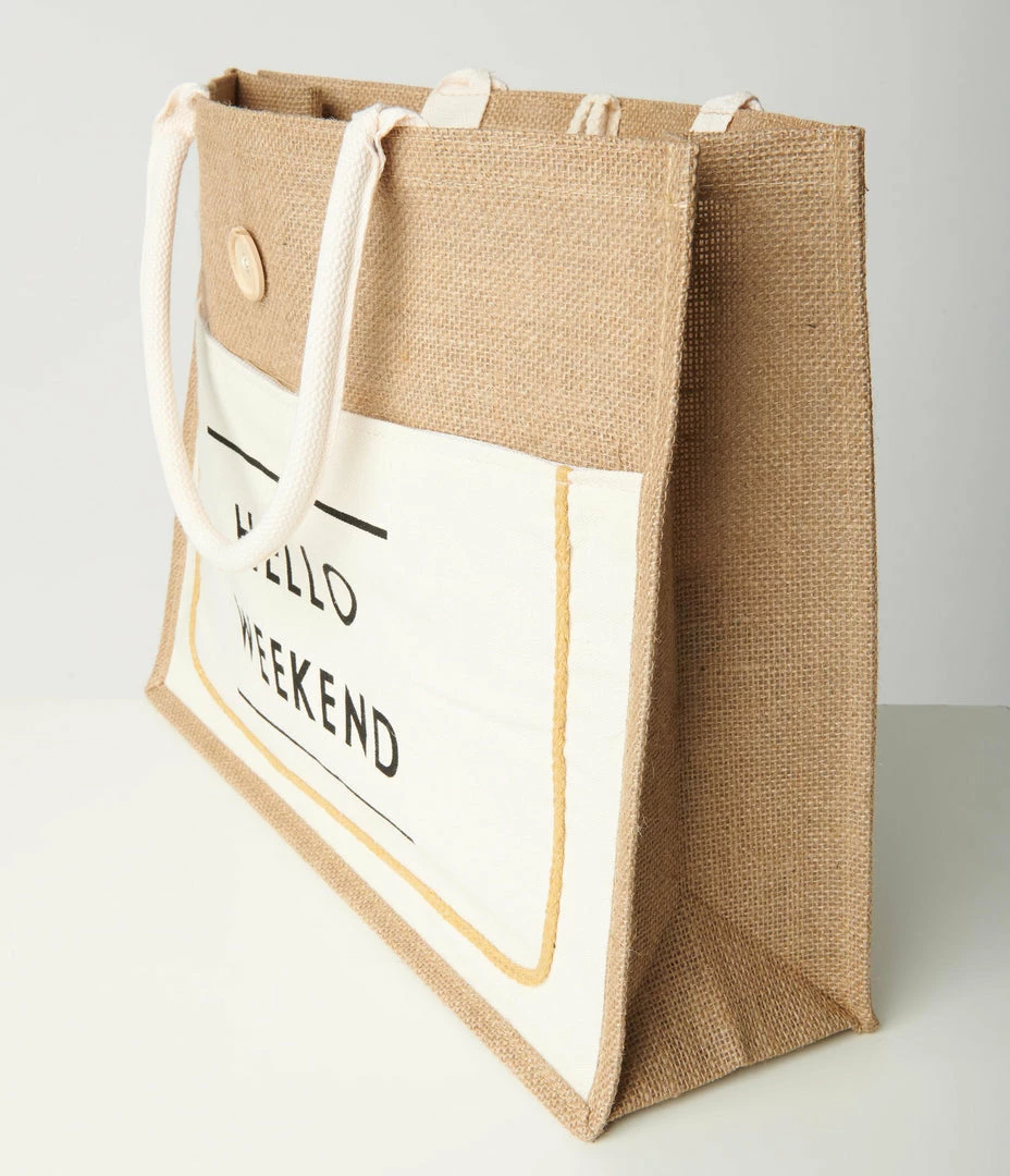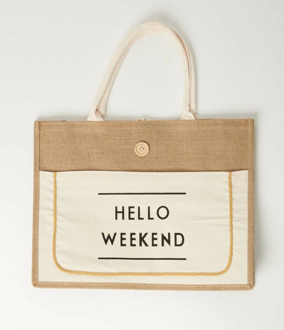 Time for the weekend, darling! This charming rectangular tote is crafted in brown burlap and boasts a fun canvas slide pocket printed with the words ‘Hello Weekend’ and secured with velcro. The dual top handles are perfect for carrying in your hard or on your arm, while the wide top opening makes it easy for you to fill to your heart’s content, and secure with a button string closure!