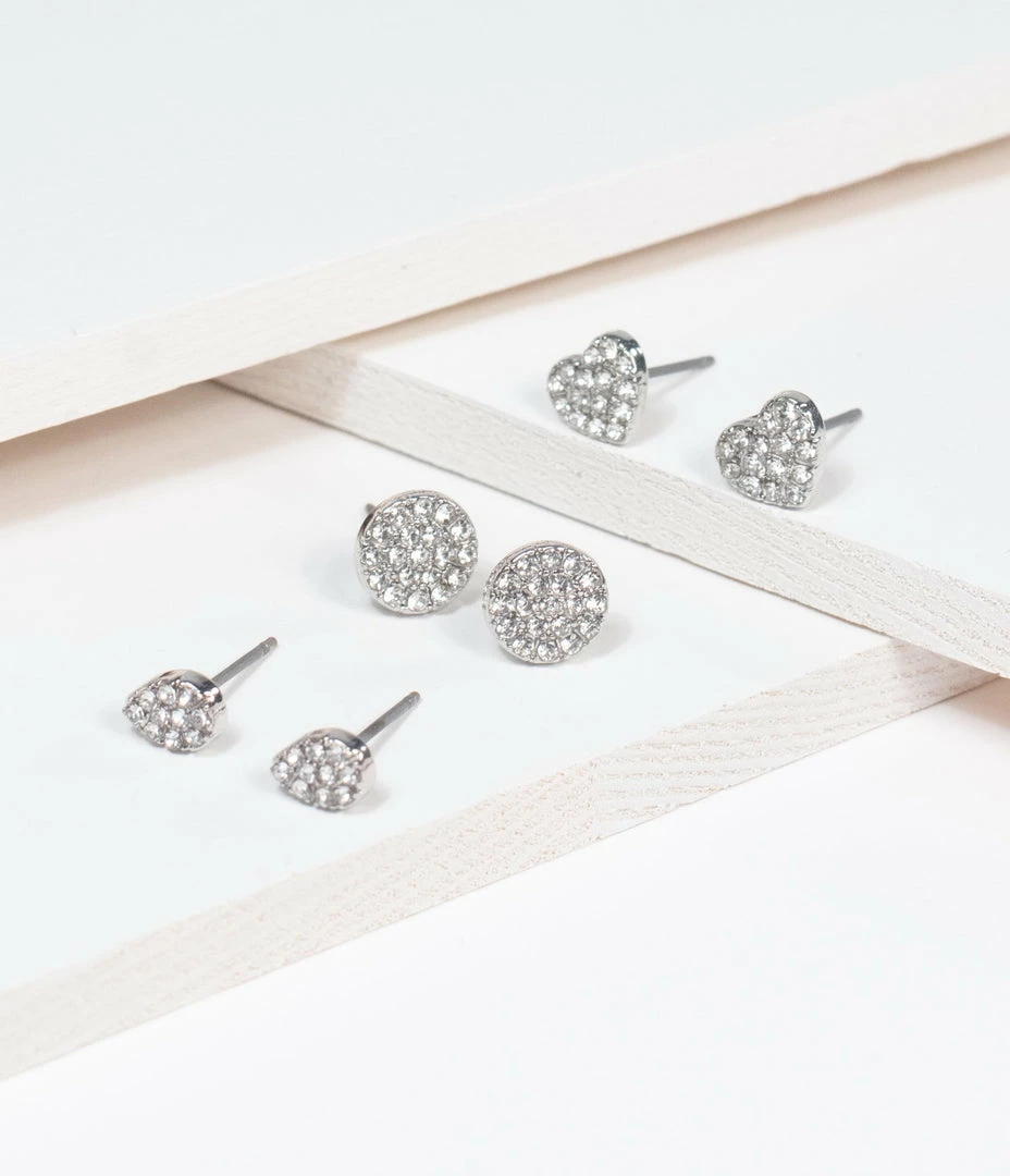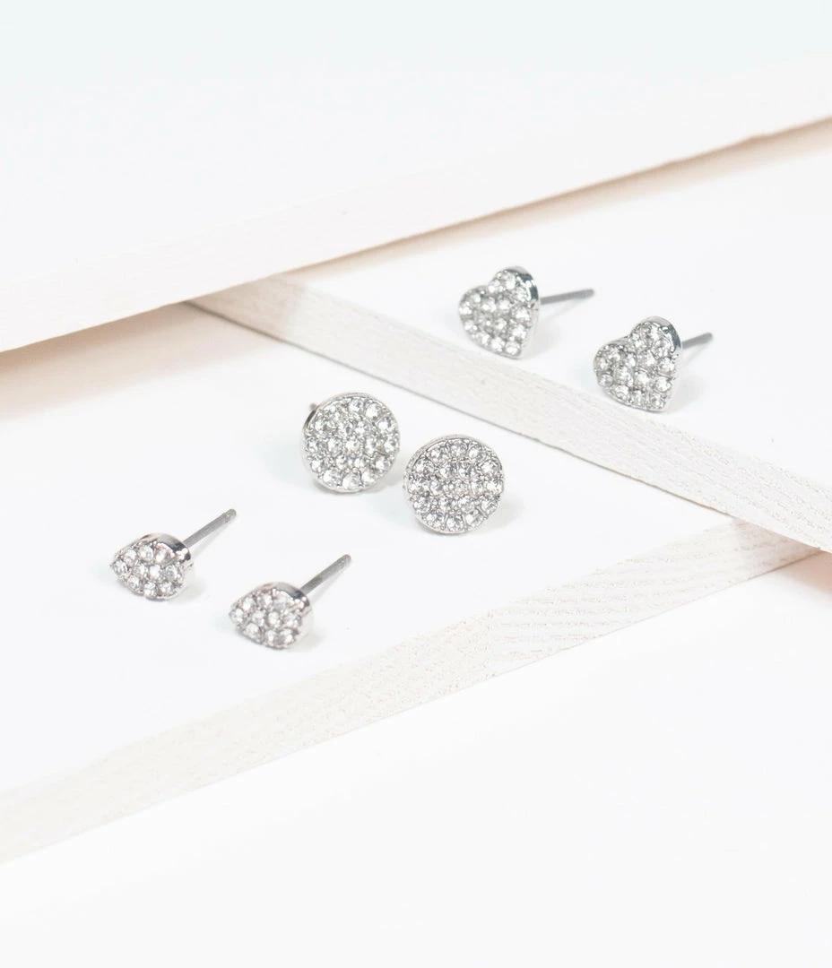 Sprinkle some sparkle on your visage! These sweet studs dazzle with silver rhinestones in circles, teardrops, and hearts. Secured with post backs!