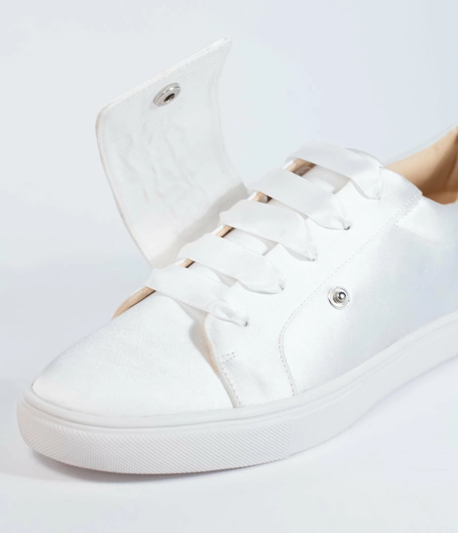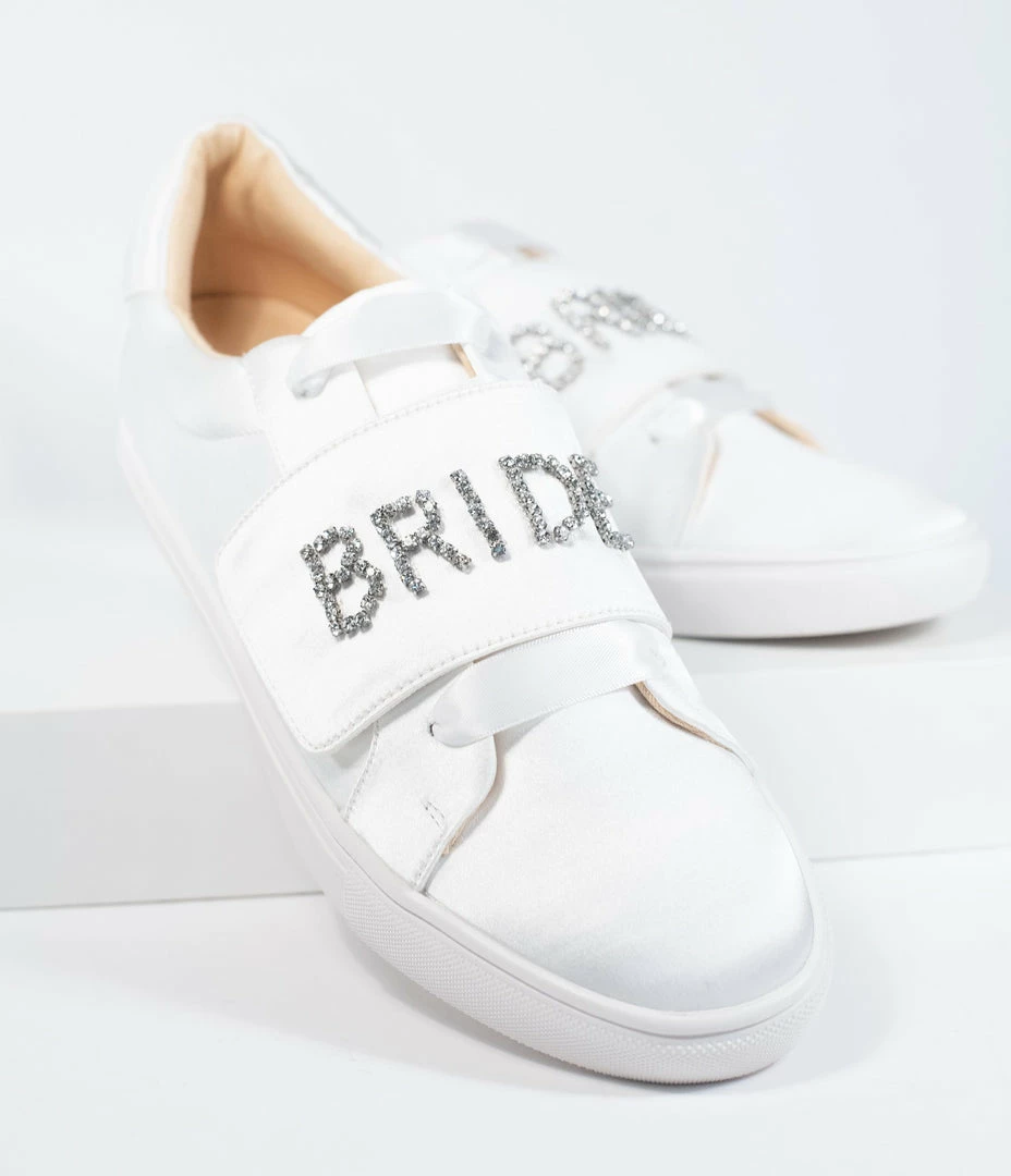 Conquer the aisle in these ivory satin sneakers from Betsey Johnson! The ribbon lace up vamp features a fold over accent that secures with a snap button and boasts a rhinestone embellishment that spells out ‘Bride’. The 1 inch sole and cushion insole provides a comfortable fit making these a perfect wedding pick!