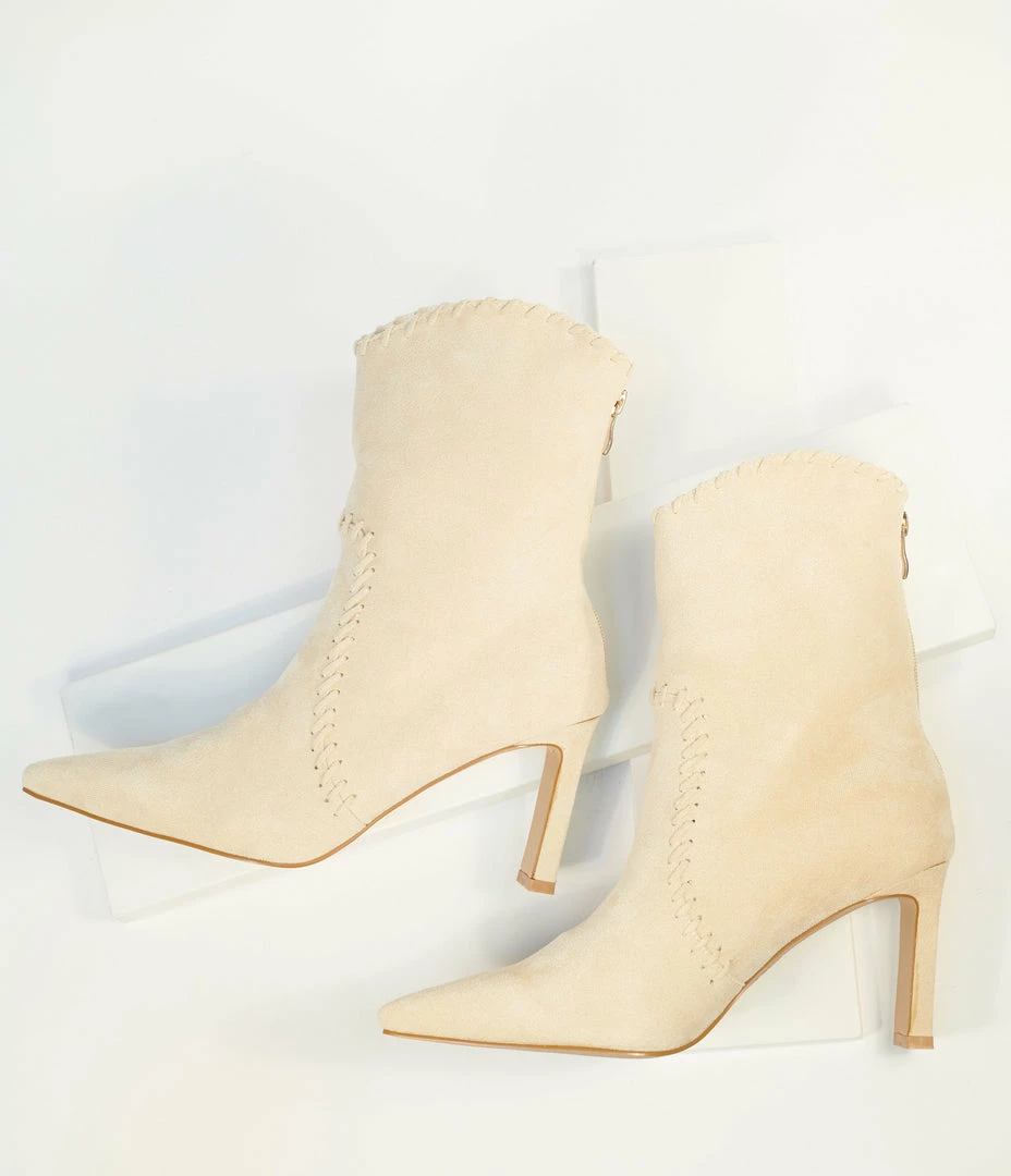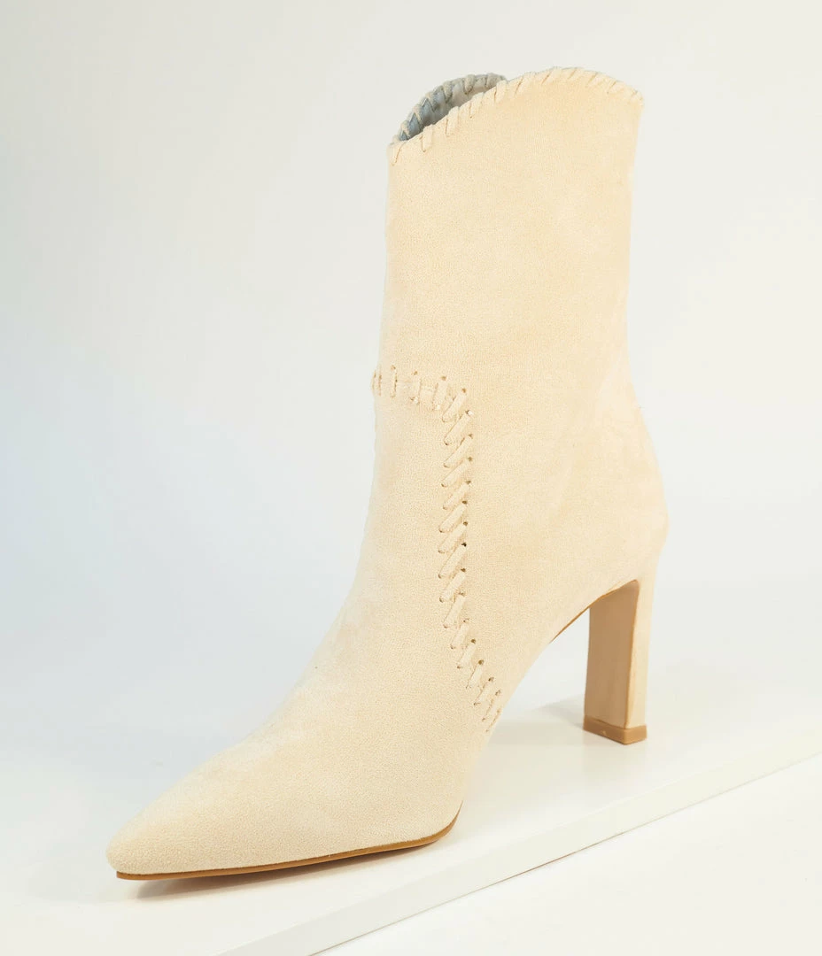 Dreaming of line dancing, darling? These cowboy style boots take your ensemble to the next level in a fabulous cream faux suede with suede stitching accents throughout. Crafted with a pointed toe, back zipper, and 3 inch stiletto heel these kicks are the perfect western touch for your night out!