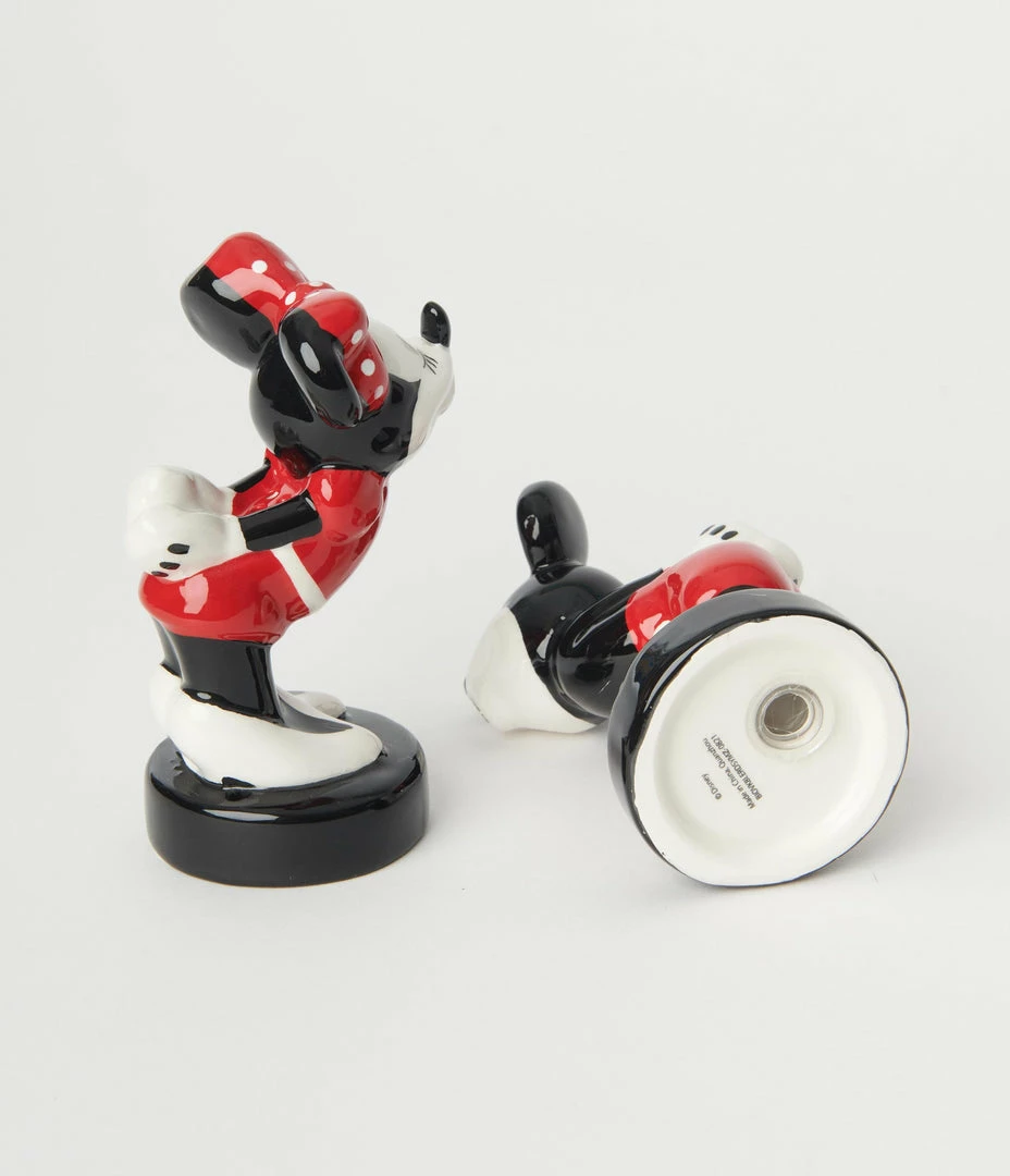 This sweet salt and pepper shaker set is crafted in ceramic and features Mickey and Minnie mouse sharing a smooch.