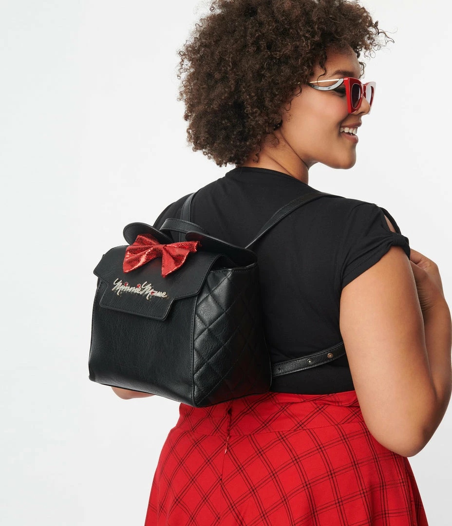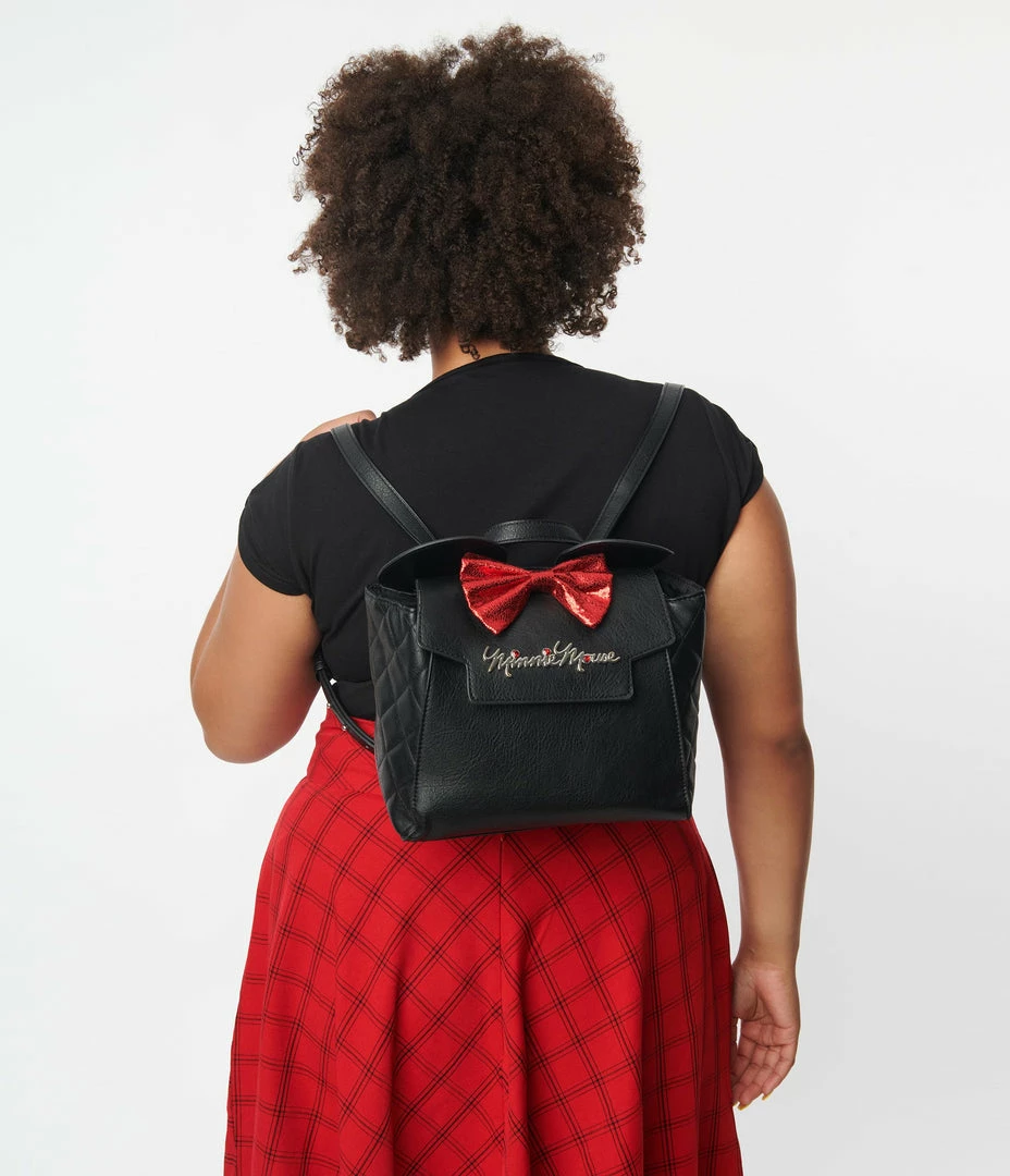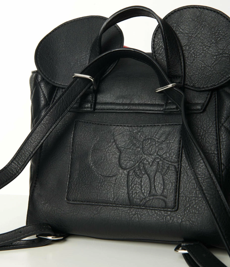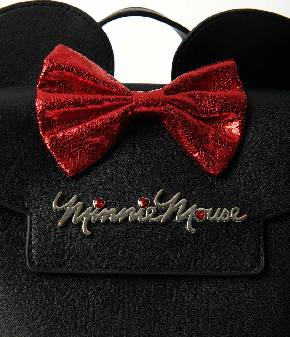 This mini backpack is crafted in black leatherette, and boasts sweet Minnie Mouse ears and a red bow on the top. Complete with convertible & adjustable backpack straps, fold over top, and magnetic and zip closures.