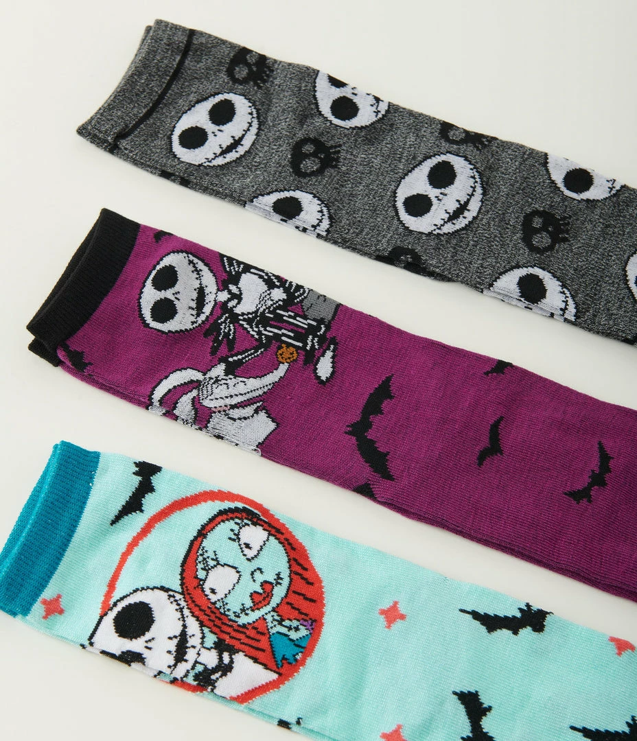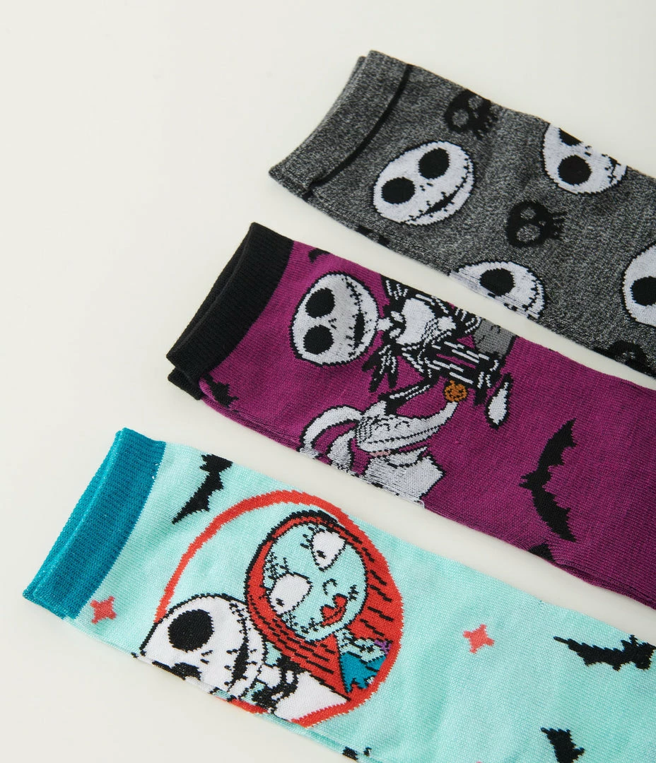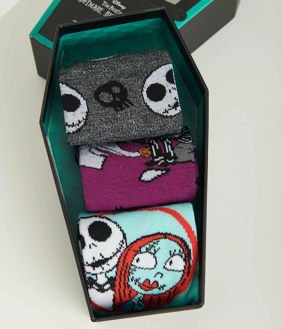 This crew sock set features three sets of The Nightmare Before Christmas motifs and characters, printed throughout the knit fabric. Complete in a coffin shaped box.