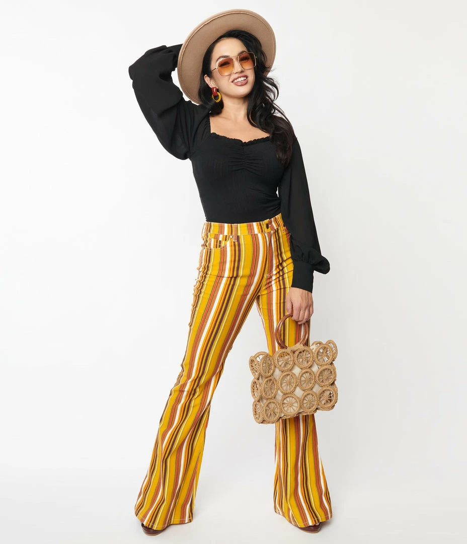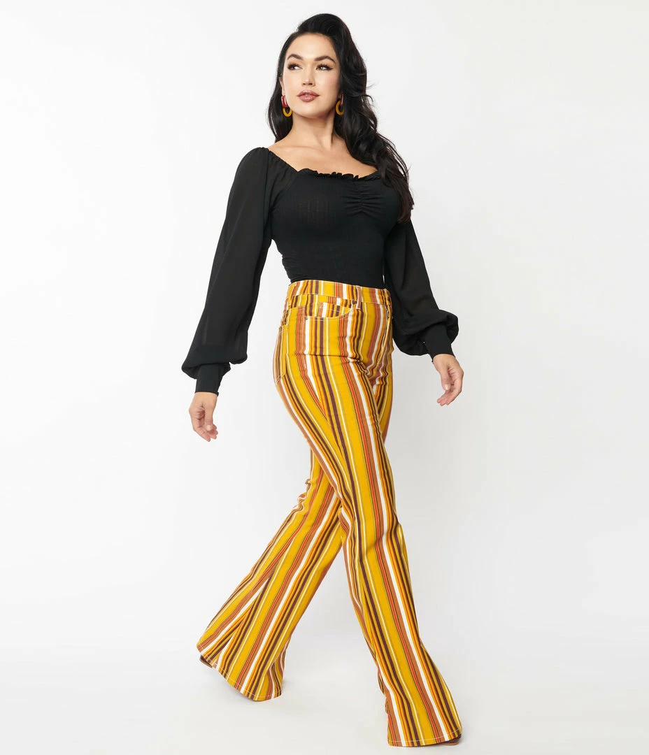 Be the first to review “Bottoms Unique Vintage Orange & Yellow Stripe Denim Flare Jeans” Cancel reply