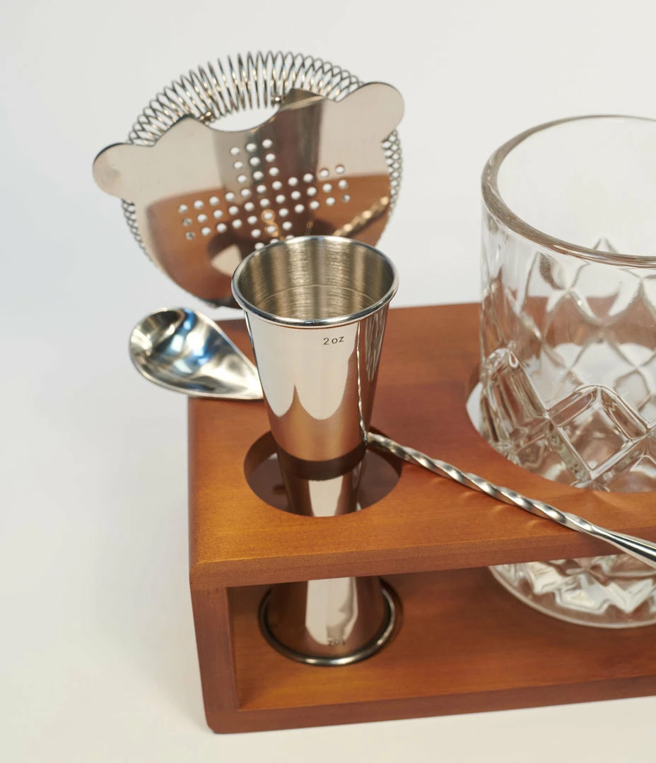 This travel size bartender kit makes it convenient to bring the party anywhere you go. Complete with a crystal mixing glass, strainer, stirring spoon, steel jigger, and wooden stand.