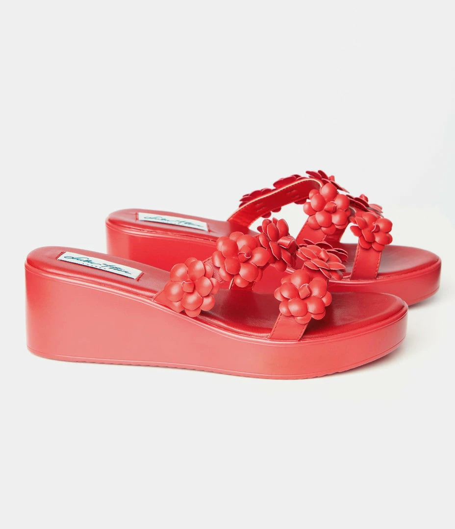 These sizzling sandals are crafted in a red leatherette that featured darling leatherette florals on the dual straps. Complete with a 2.5 inch wedge and 1 inch platform, complete with a cushion insole.