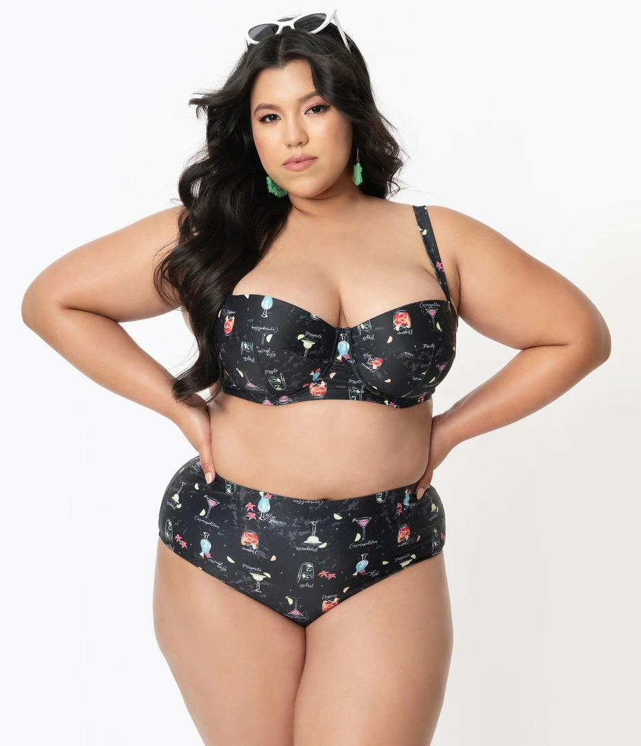 Collectif Plus Size Black & Cocktail Menu Print Balcony Swim Top Swimwear