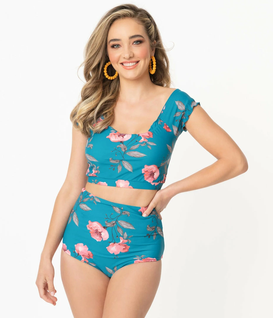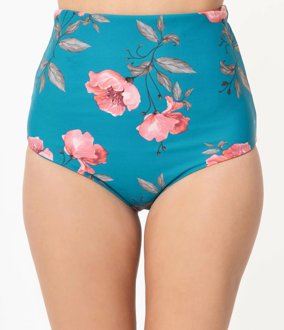Coral Reef Swim Teal & Pink Floral Reversible High Waisted Swim Bottom Swimwear