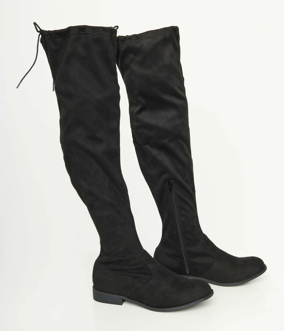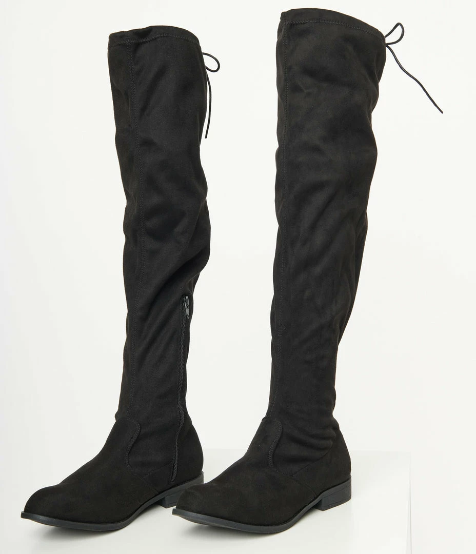 Top off your ensemble with these comfy and chic thigh-high boots, crafted in black faux suede to flatter your gams while a mid side zipper and a drawstring top provide secure wear. Outfitted with a 1 inch heel for a dainty lift!