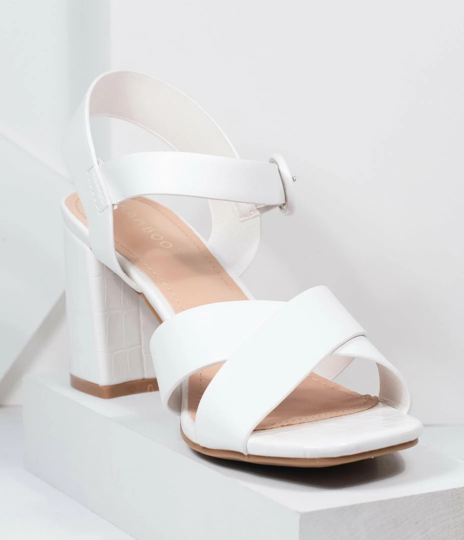 Take a stroll with vintage verve! A classic pair of white leatherette sandals, these retro kicks boast an embossed crocodile pattern throughout the 3 inch block heel for a dash of edge to your lift. The open toe sandal design is secured with a gored and adjustable ankle strap while a soft cushion insole makes it easy to wear all day and into the night.