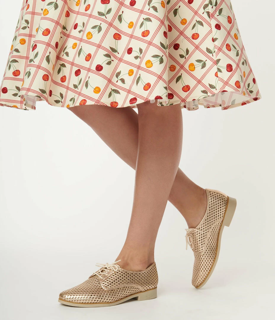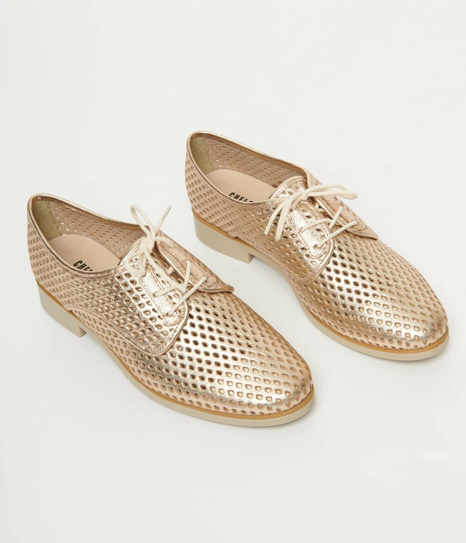 These vintage inspired Oxford shoes, crafted in gleaming rose gold leather boasting sweet cutouts throughout. The lace up vamp and 1 inch heel provide comfortable wear!