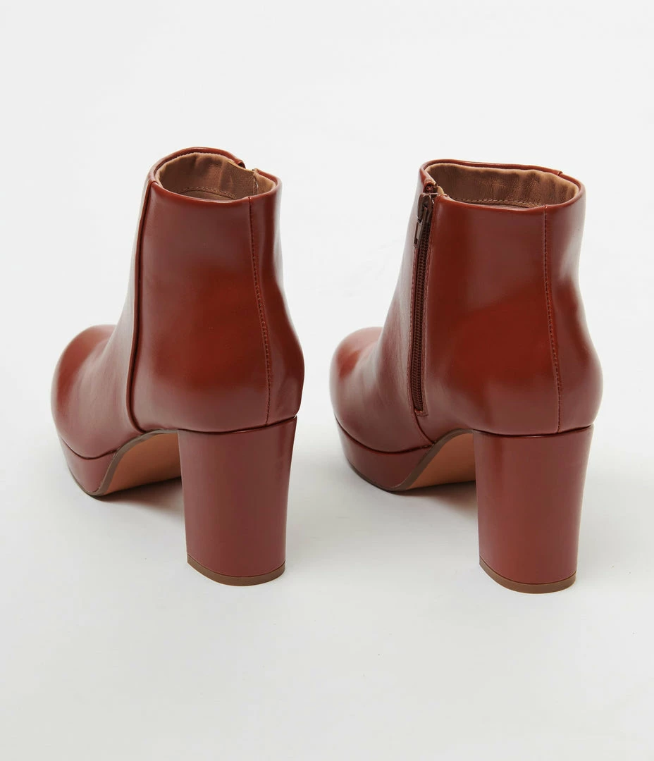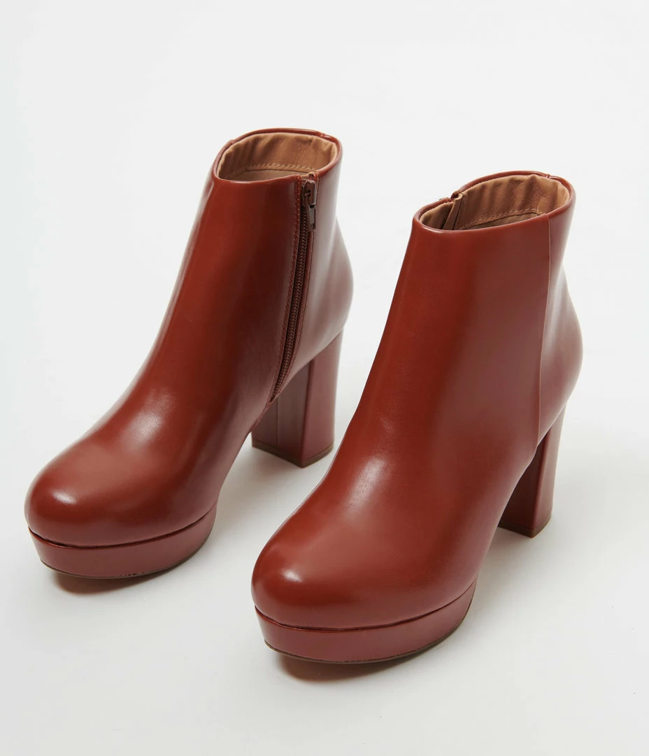 Dreaming of dance halls, darling? These stunning booties take your ensemble to the next level in a fabulous rust brown leatherette. Crafted with a leather insole and boasting a 3.5 inch heel and 1 inch platform, these charming kicks are complete with a side zipper for a secure fit!
