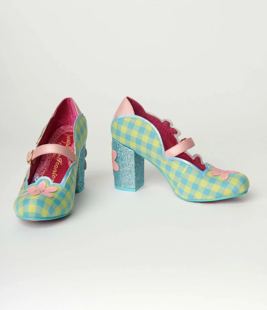 Design Asylum Manufacturing (HK) Limited (Irregular Choice Shoes) Irregular Choice Green Gingham & Pink Flower Heels 1960s