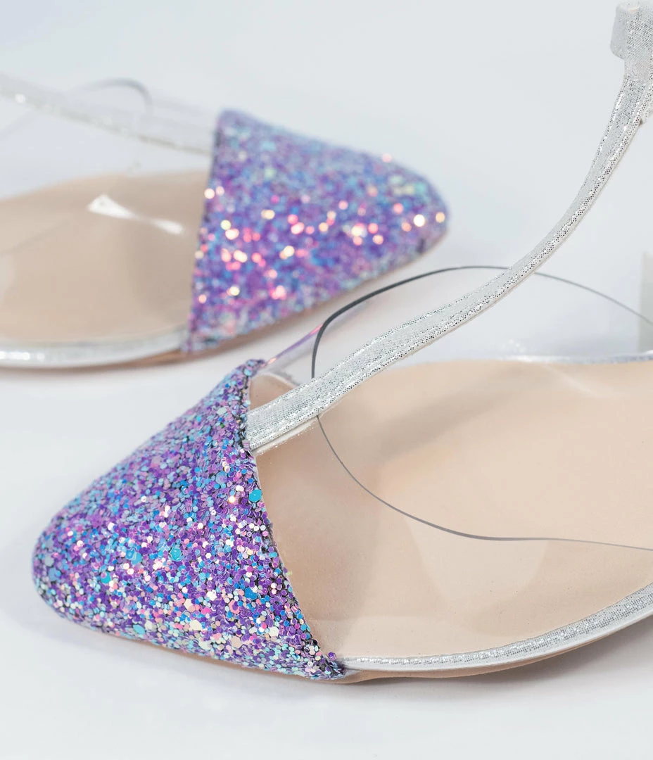 Keep the sparkle going with theses sweet flats, crafted in a clear vinyl and dazzling with lilac purple glitter on the pointed toe. Silver leatherette highlight the t-strap while a gored and adjustable ankle strap keeps these kicks secure!