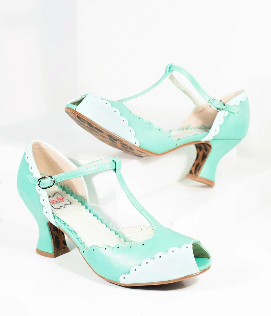 Cute all day long! The turquoise mint Carlie heels are vintage t-strap perfection, chic enough for day time frolics. Crafted in man-made materials from Bettie Page, these adorable kicks boast a charming T-strap and peep toe vamp, while color blocked mint layers boast scalloped detail for a truly feminine feel. Complete with a gored adjustable buckle, a polka dot cushioned insole, and a 2.5” heel to dance the days away!