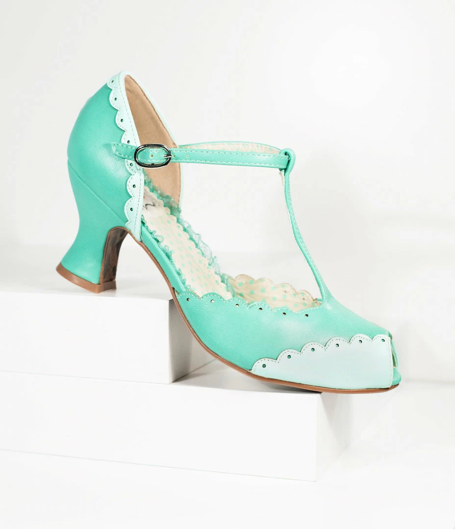 Ellie Shoes Bettie Page 1940s Mint Scalloped Peep Toe T-Strap Carlie Heels
