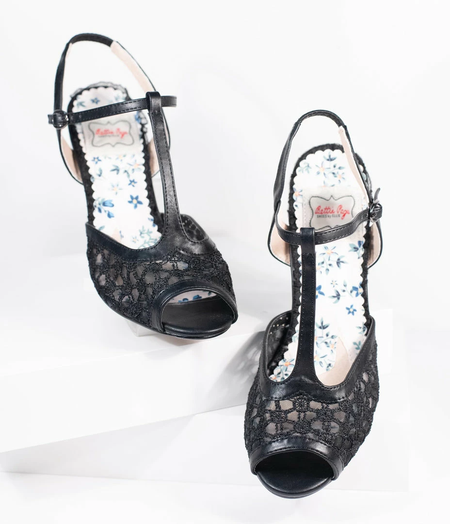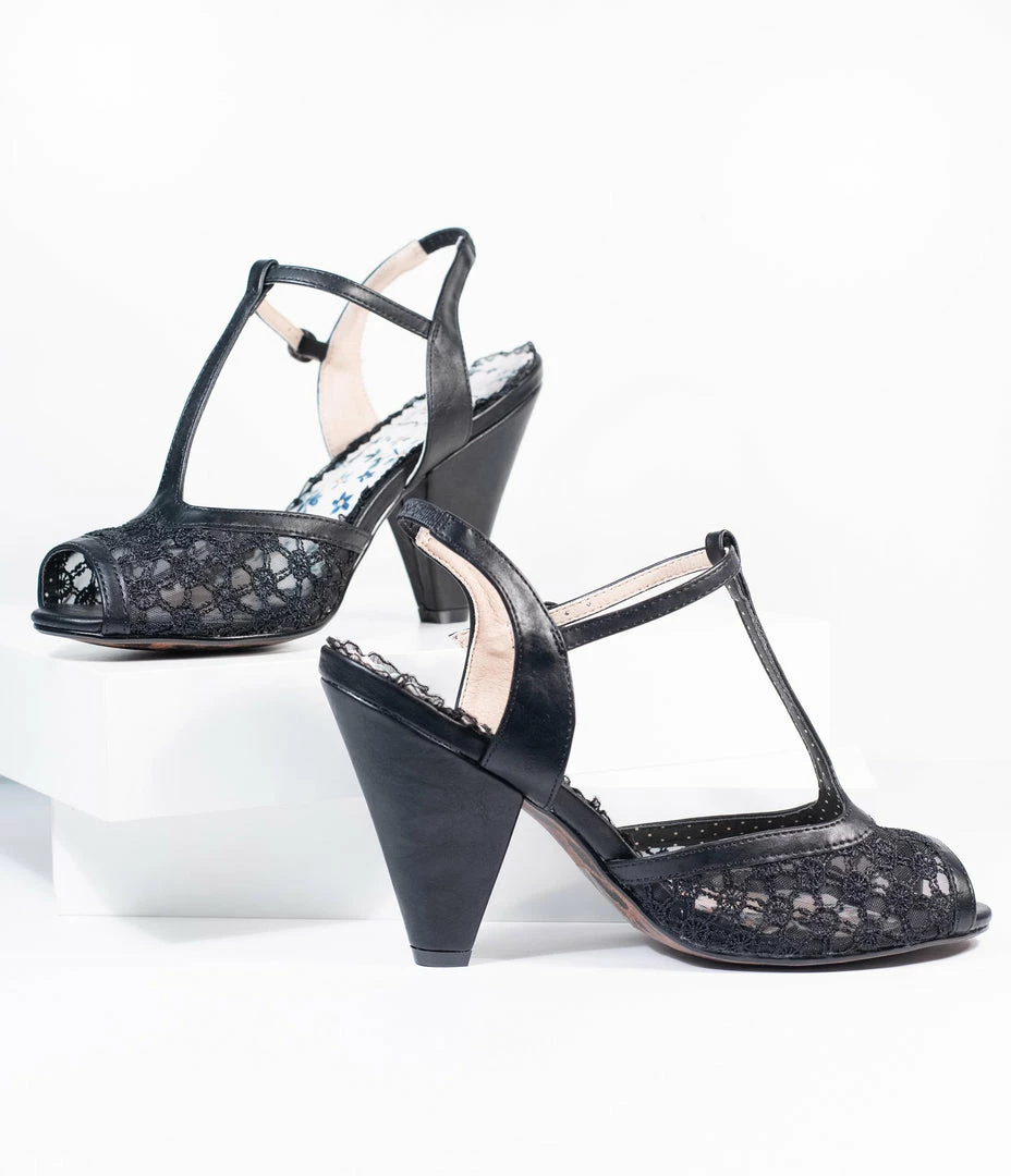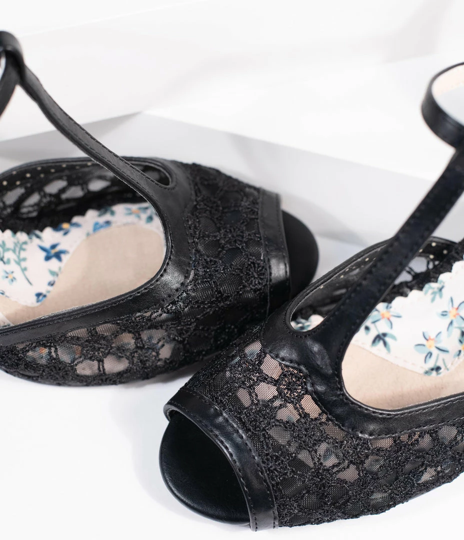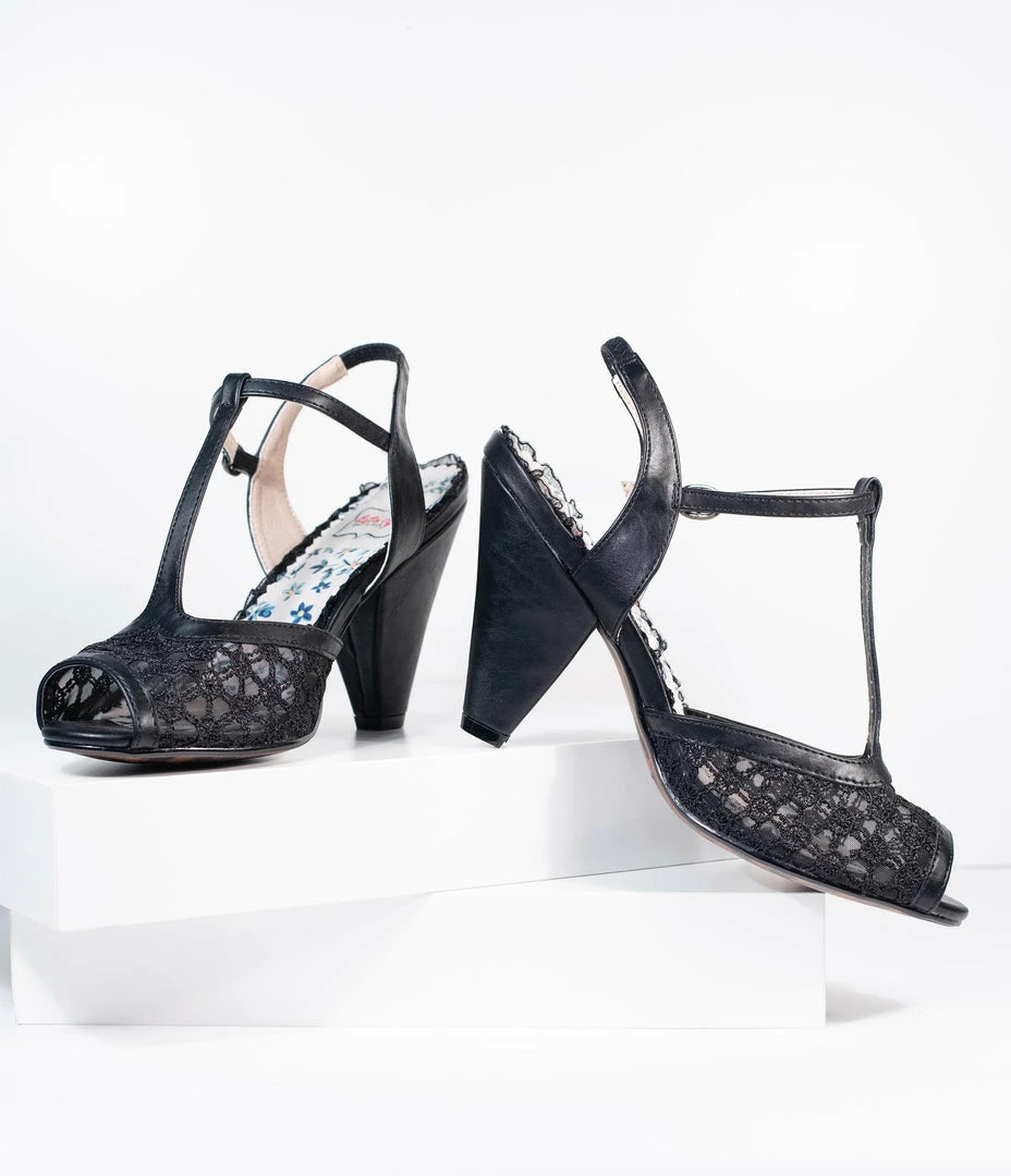 Ellie Shoes Bettie Page Black Lace Brooklyn T-Strap Heels