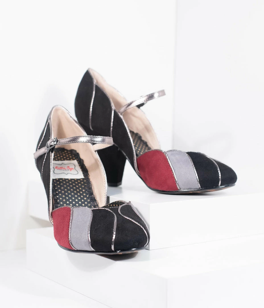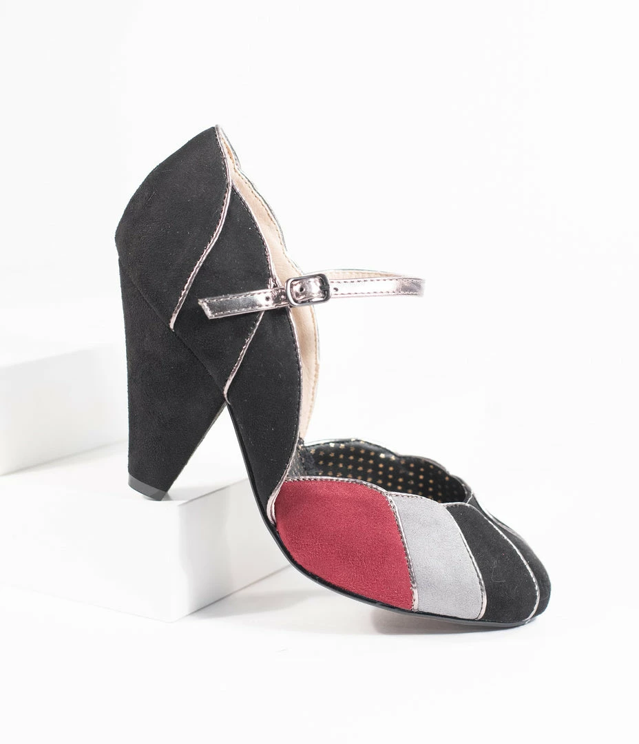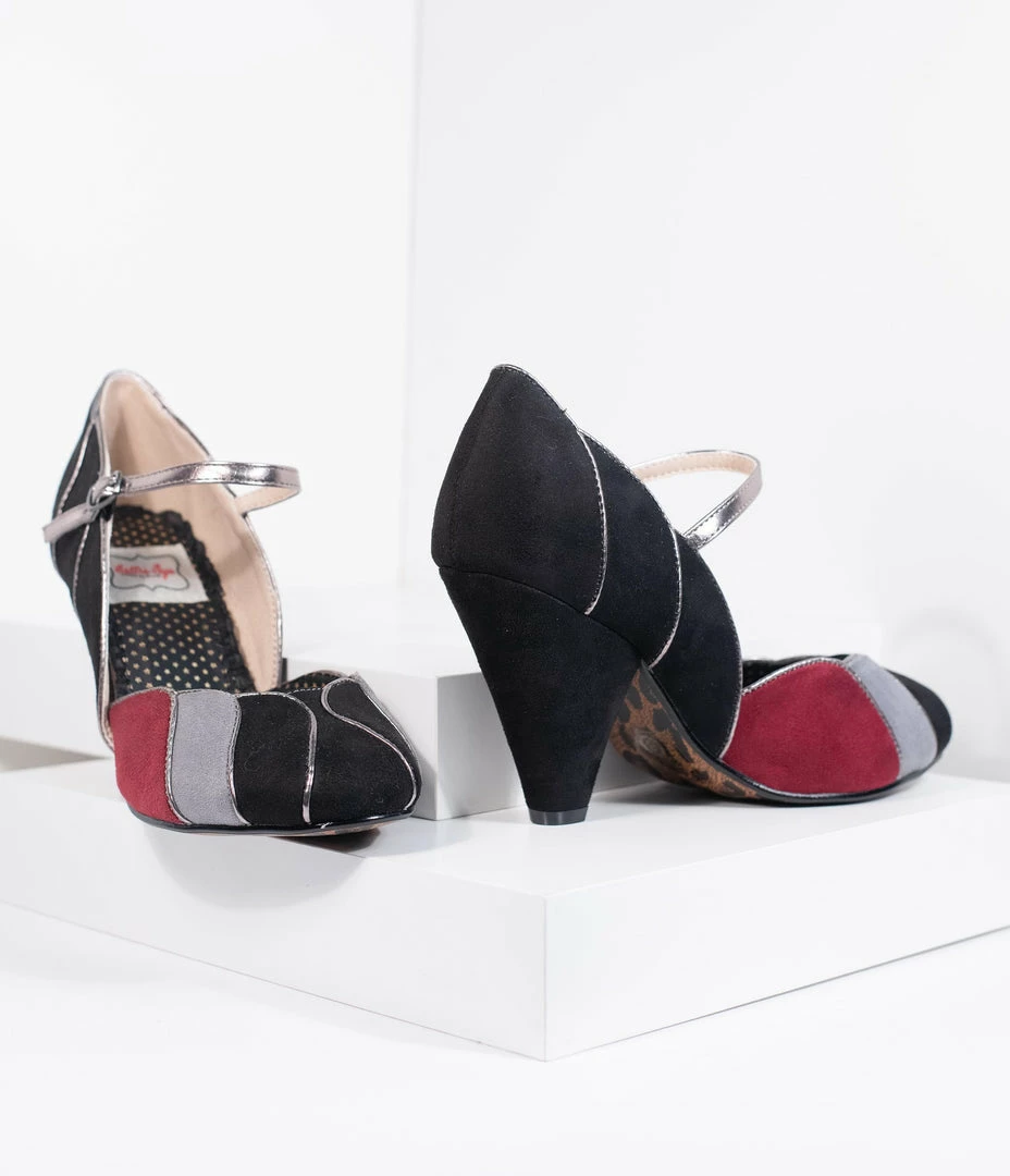 We’ve found the way to stand out, dames! A set of elegant black pumps from Bettie Page and crafted in a soft faux suede, featuring pops of grey and burgundy colors. The Mary Jane design boasts a scalloped vamp with gleaming piping while the 4” heel provides a stunning lift. The adjustable and gored ankle strap lends a secure fit for a pair of vivacious vintage-inspired stunners!