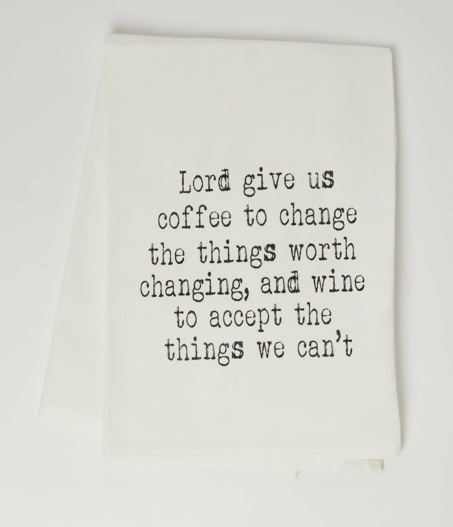 Coffee and Wine, do we need to drink anything else? This sassy cotton tea towel features a screen print of the words, “Lord Give Us Coffee to Change the Things Worth Changing, and Wine to Accept the Things We Can’t”.
