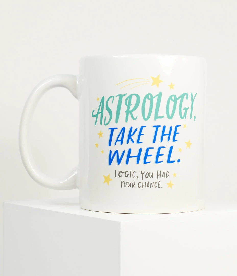 When nothing in the world makes any sense, maybe it’s time to throw logic out the window! This charming ceramic mug is just the thing to remind you that maybe it’s just written in the stars. The crisp white backdrop showcases the words ‘Astrology, Take The Wheel. Logic, You Had Your Chance.’ surrounded by bright yellow stars!