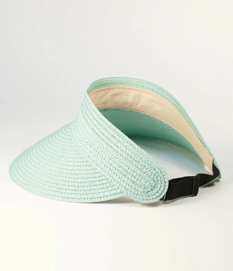 This adorable visor is crafted in a light turquoise braided paper straw and boasts a 4.5 inch brim. Outfitted with an inner comfort band and an adjustable elastic band for easy adjustment.