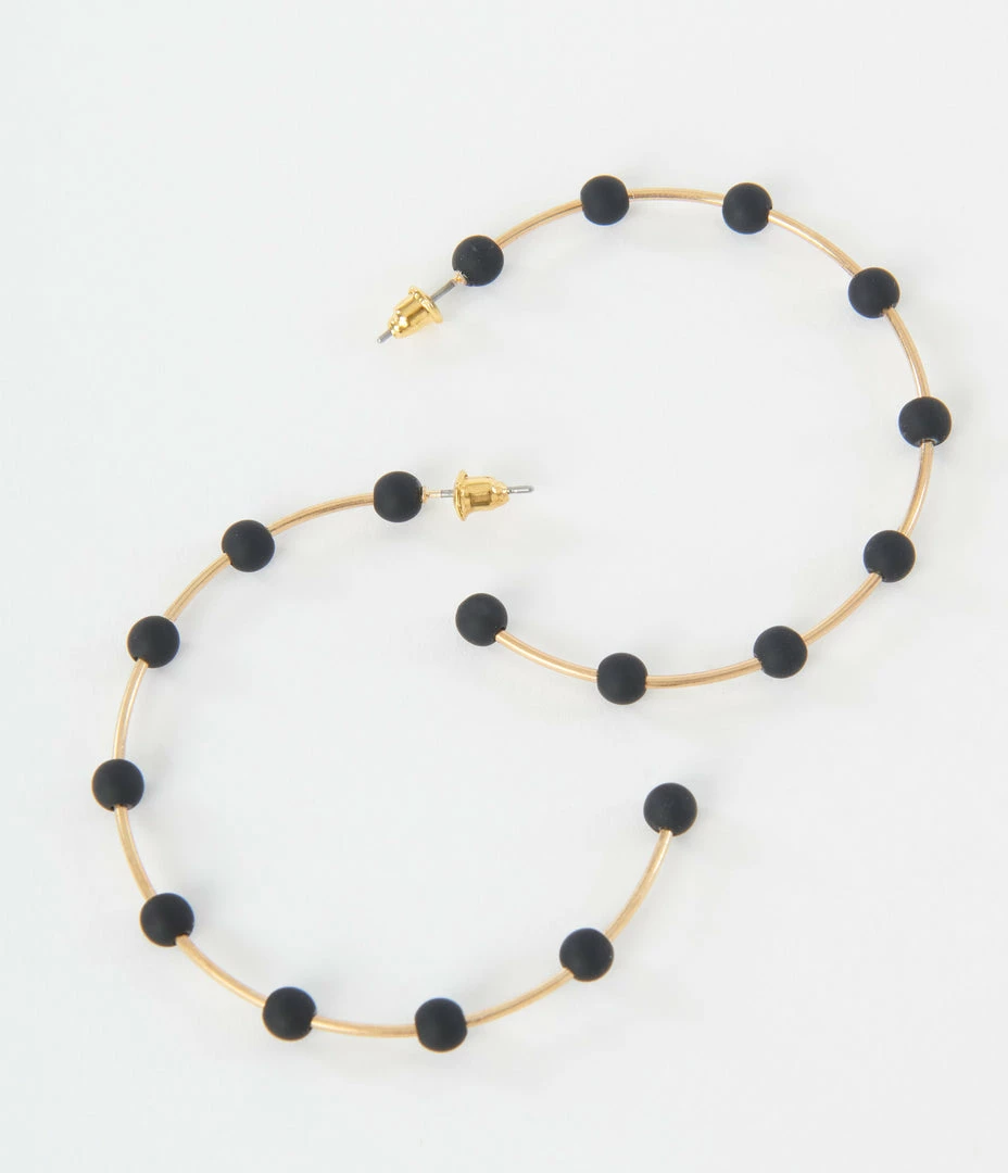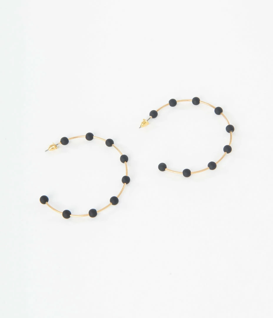 These chic hoop earrings are crafted in golden hardware wire and feature black matte beads. Secured with post backs.