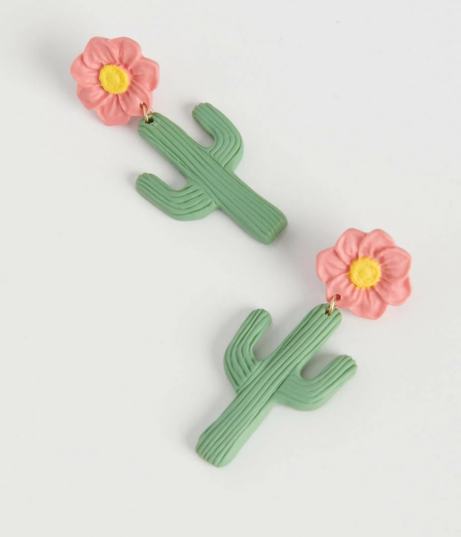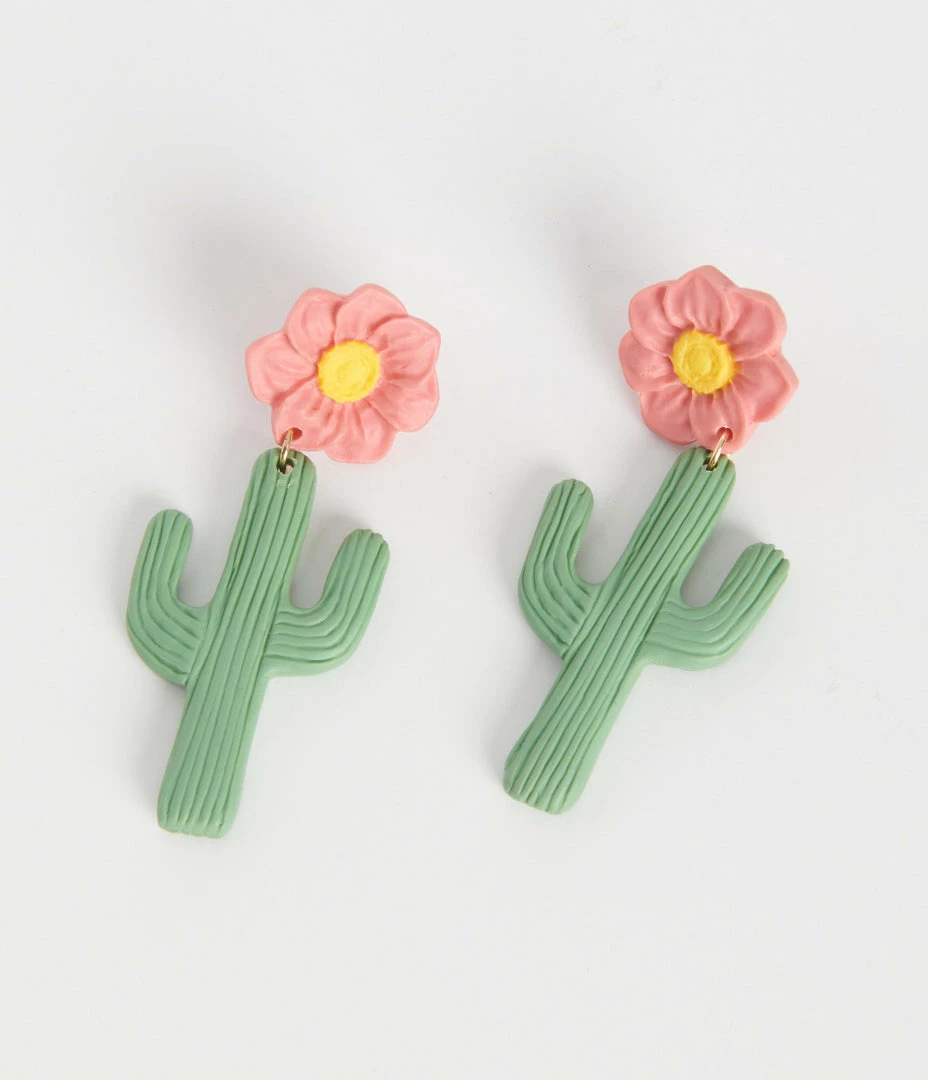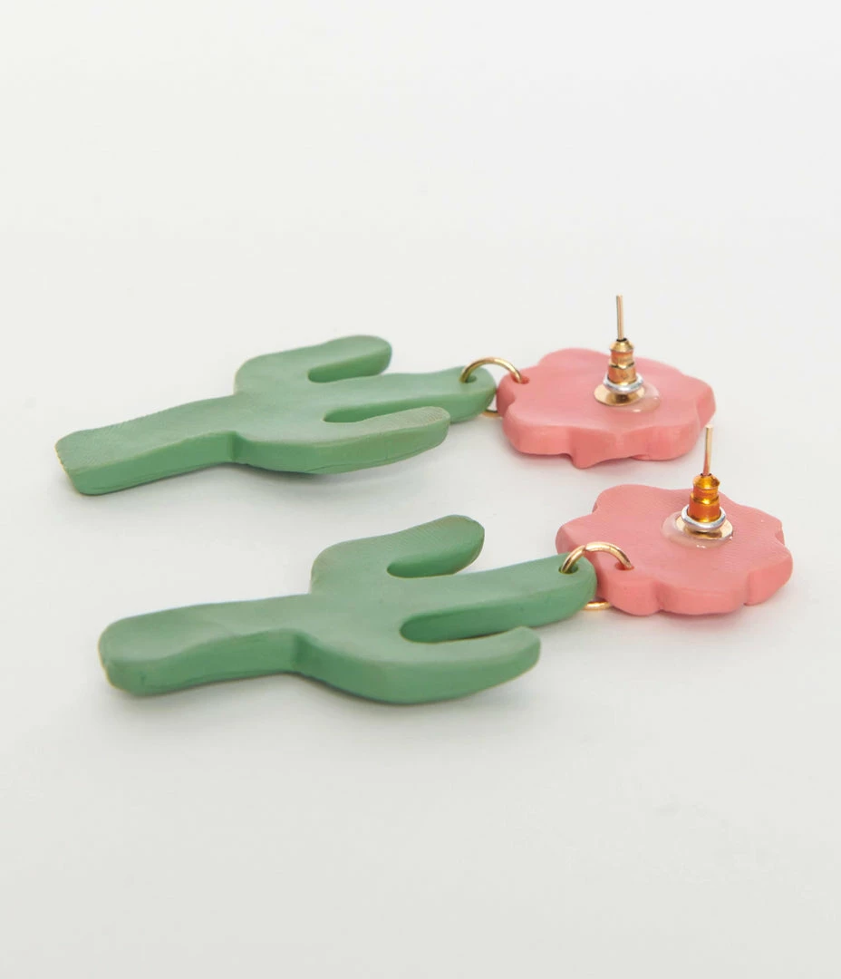 A sweet pair of earrings cast in clay boasting an adorable green cactus dropping from a pink cactus flower. Complete with post backs.