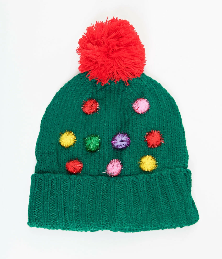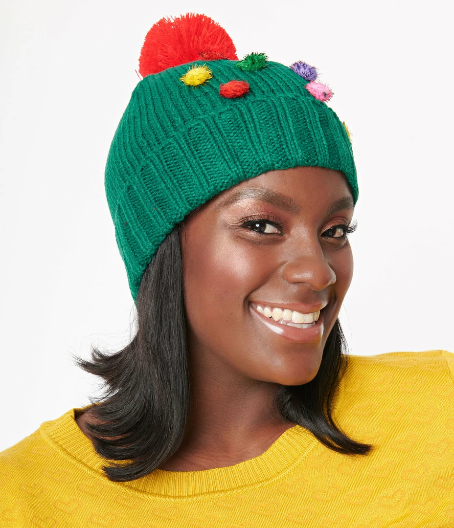 Deck the halls in this adorable beanie, crafted in bright green and boasting multicolor mini pom poms on the front, and a large red pom pom on top. Complete with ribbed fold over headband provide a cute and comfortable style!