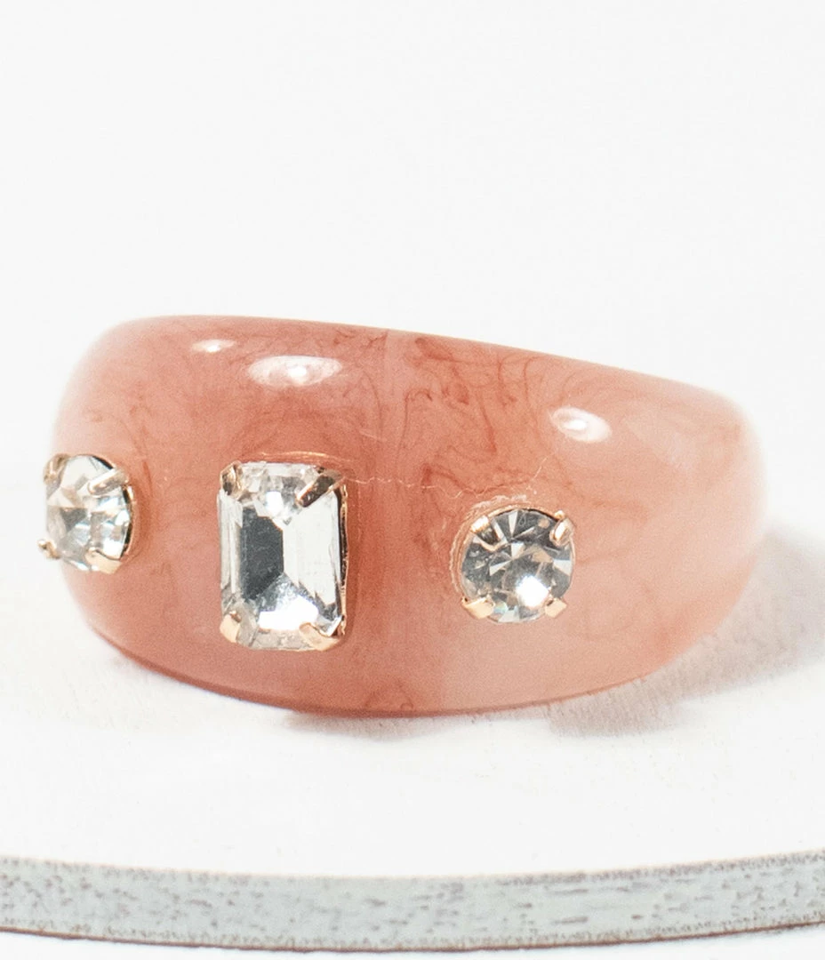 Make it a triple, darling! This charming ring is crafted in marbled pink resin and features a triple rhinestone design set in golden hardware.