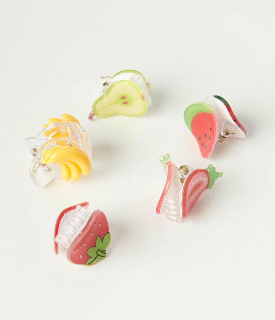 This adorable set of small claw hair clips features a sliced pear, a full strawberry, a slice of watermelon, a bunch of bananas, and a sliced strawberry with sparkling glitter.