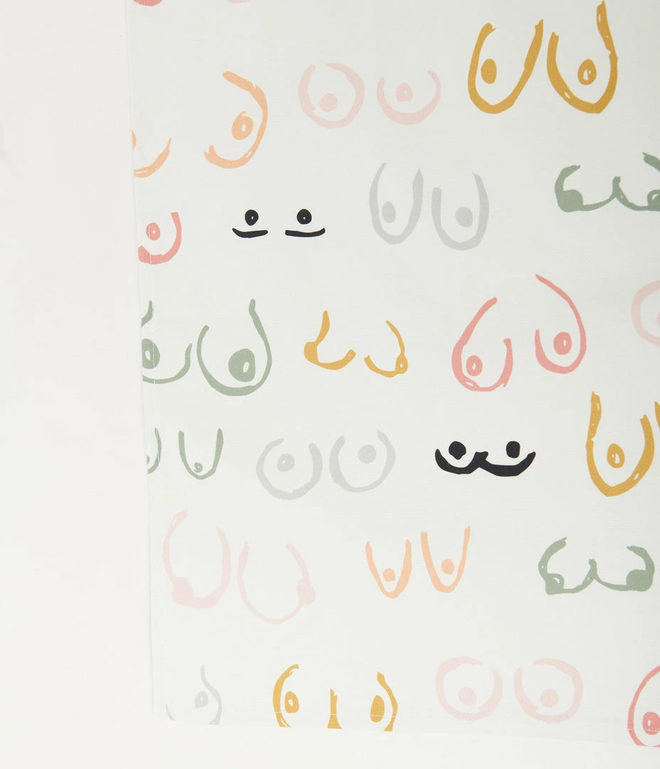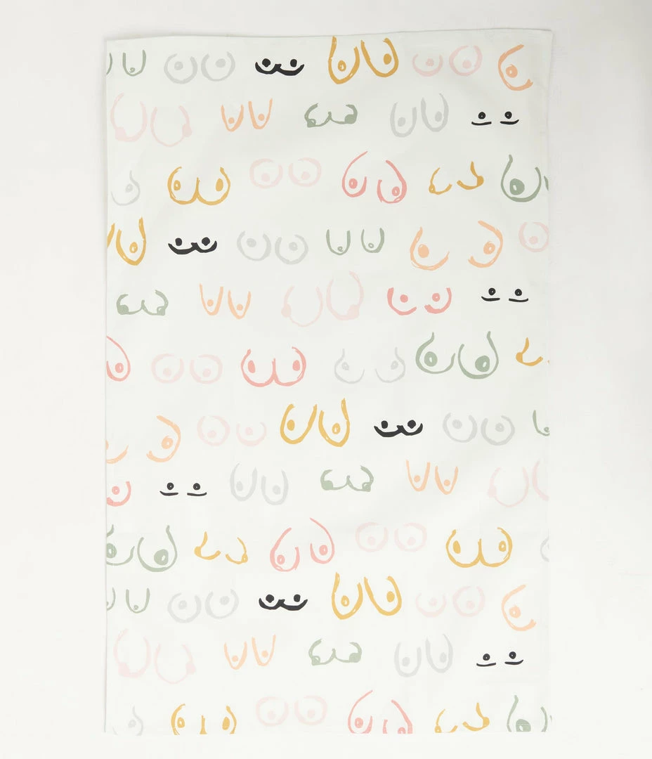 Add a head-turning accent to your home with this cheeky tea towel, crafted in cotton and featuring a bold print of multicolor breasts throughout!