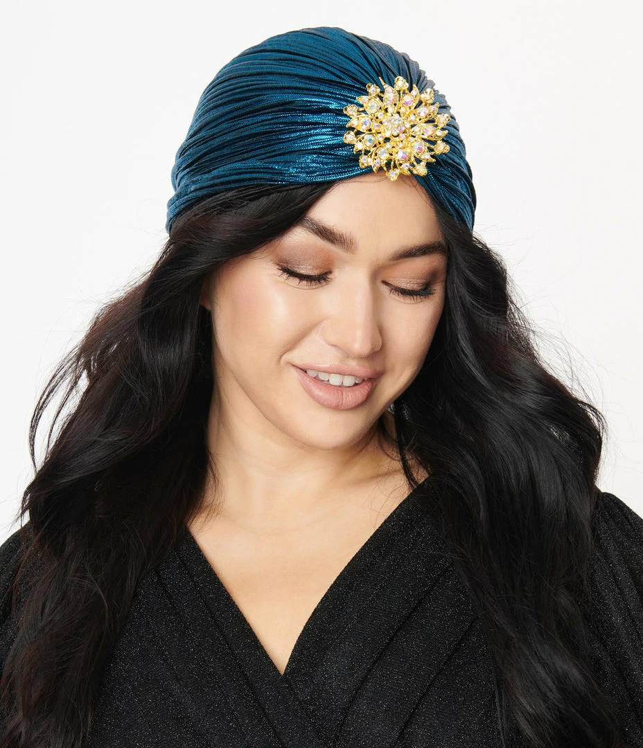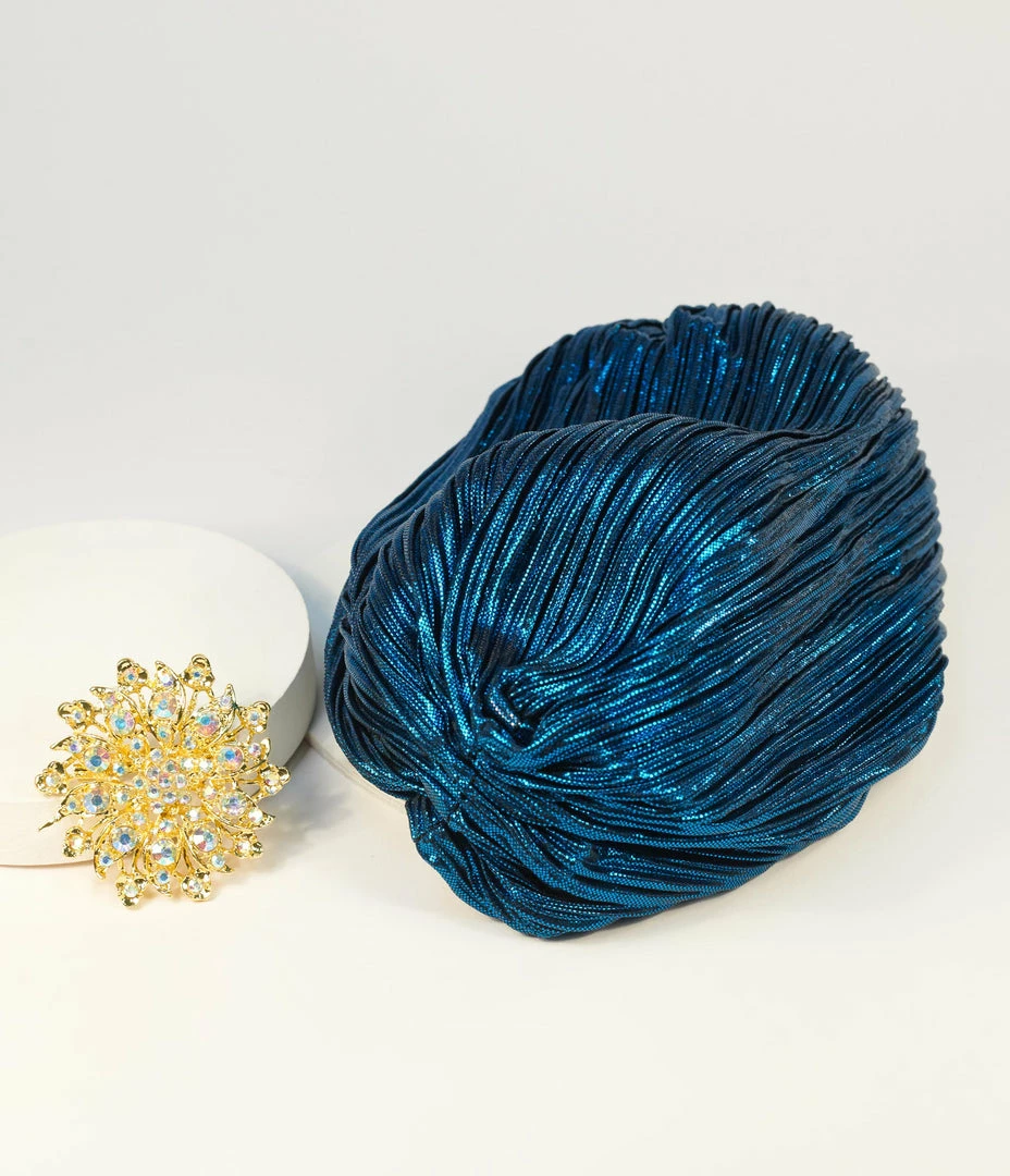 A Hollywood fashion statement form Collectif, this glamorous blue metallic turban is the perfect accessory for a bold vintage style while also working as a protector or covering up those bad hair days. Ready to wear with no fuss, fits comfortably, with stretch to fit most heads and hair length and complete with a brilliant brooch!