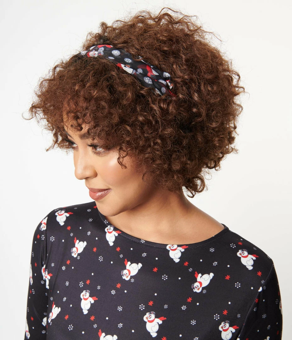 Look who came to life, gals! A lovable accessory in collaboration with Frosty the Snowman, this charming hair scarf from Unique Vintage boasts an amusing print of Frosty with their red scarf cascading through snowflakes over a black backdrop! A lightweight vintage inspired chiffon scarf perfect for tying up and around your ‘do – any excuse for a little sky-high hair help!