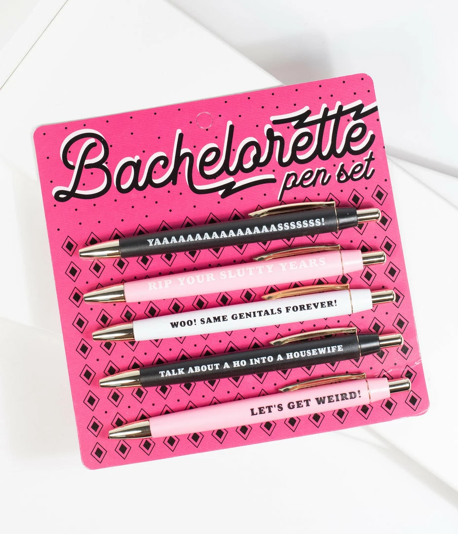 This set of five ballpoint retractable pens come in light pink, black, and white and boast a variety of bridal statements, ‘RIP Your Slutty Years’, ‘Let’s Get Weird’, ‘YAAASSS!’, ‘Talk About A Ho Into A Housewife’, and ‘Woo! Same Genitals Forever!’.