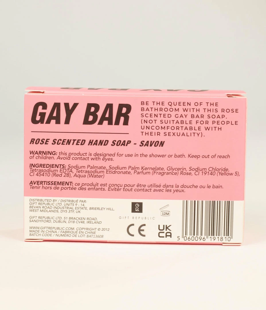 Be the queen of the bathroom! Indulge yourself in our wonderfully fragrant rose scented lather, with this fabulous Gay Bar soap. Straight, gay, bi-sexual, transsexual, metrosexual, or whatever- everyone is welcomed with open arms with this gay bar!