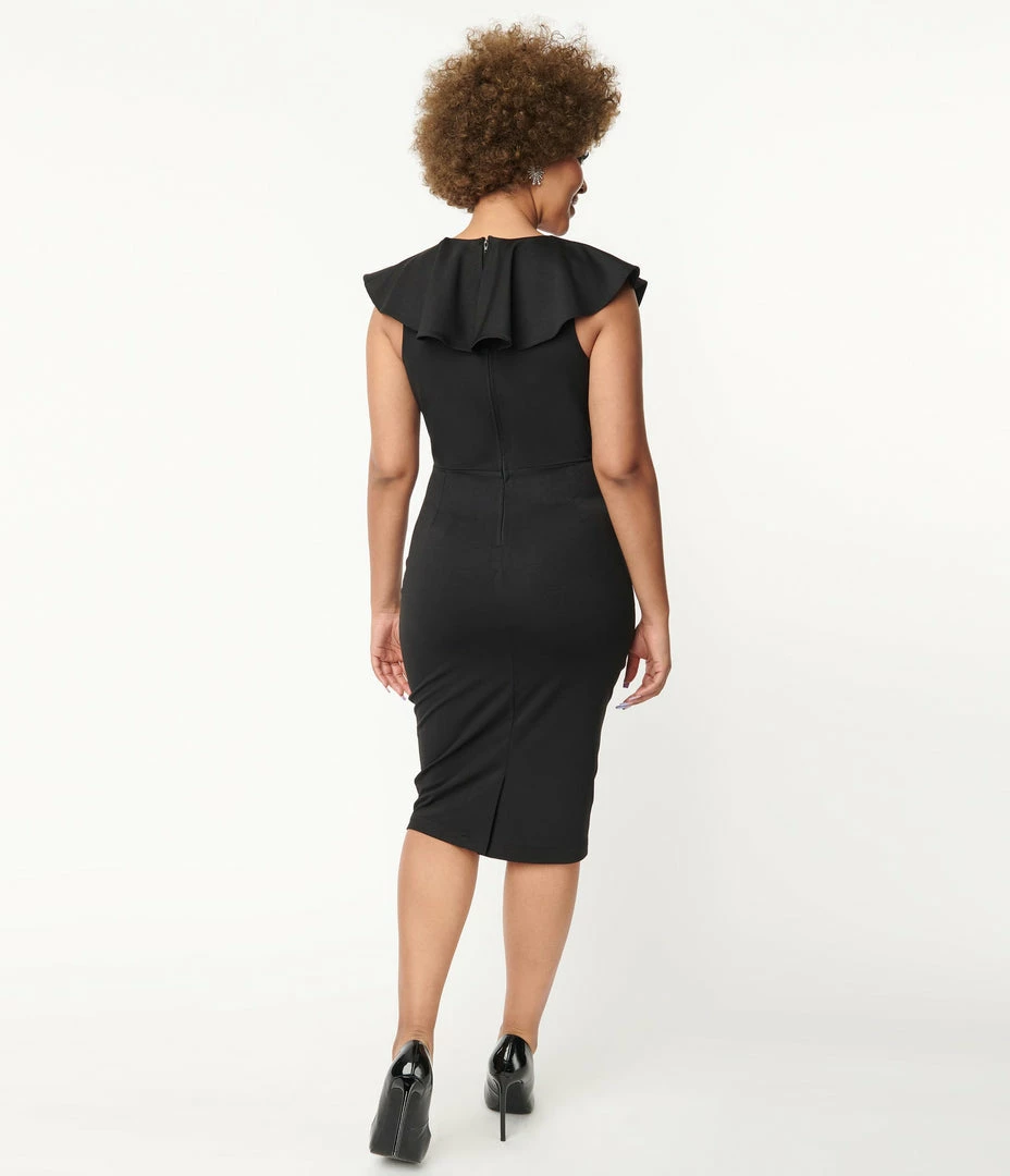 A vintage inspired wiggle style dress, crafted in a black stretch knit and featuring a surplice V-neckline, embellished with ruffles. Complete with a back zipper and a back vent.